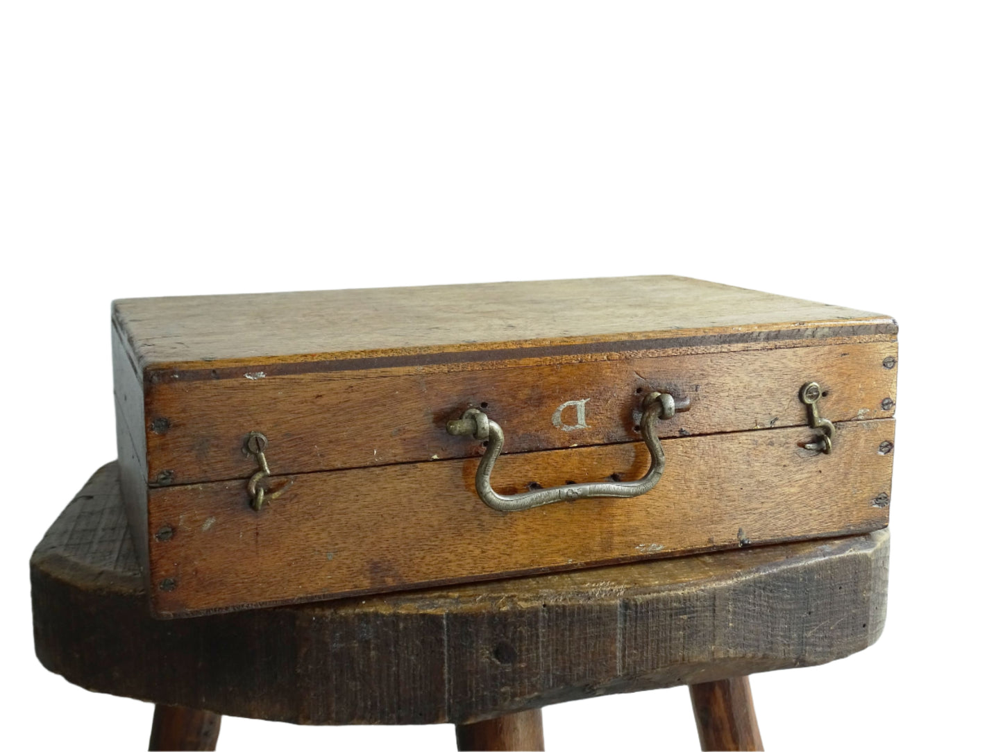 Beautiful French antique paint box filled with paint brushes and painter’s tools. It has specks of paint and the outside of the wooden box has a “D” initial. It has an absolutely gorgeous patina and dates to the 19th century. This stunning artist's box would make a wonderful decorative accent.