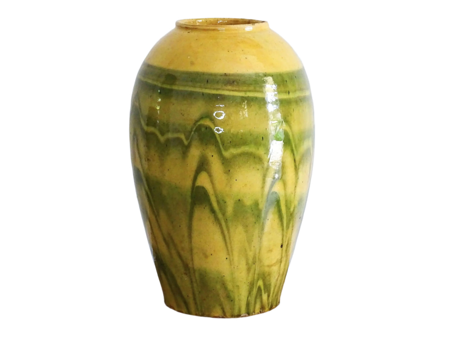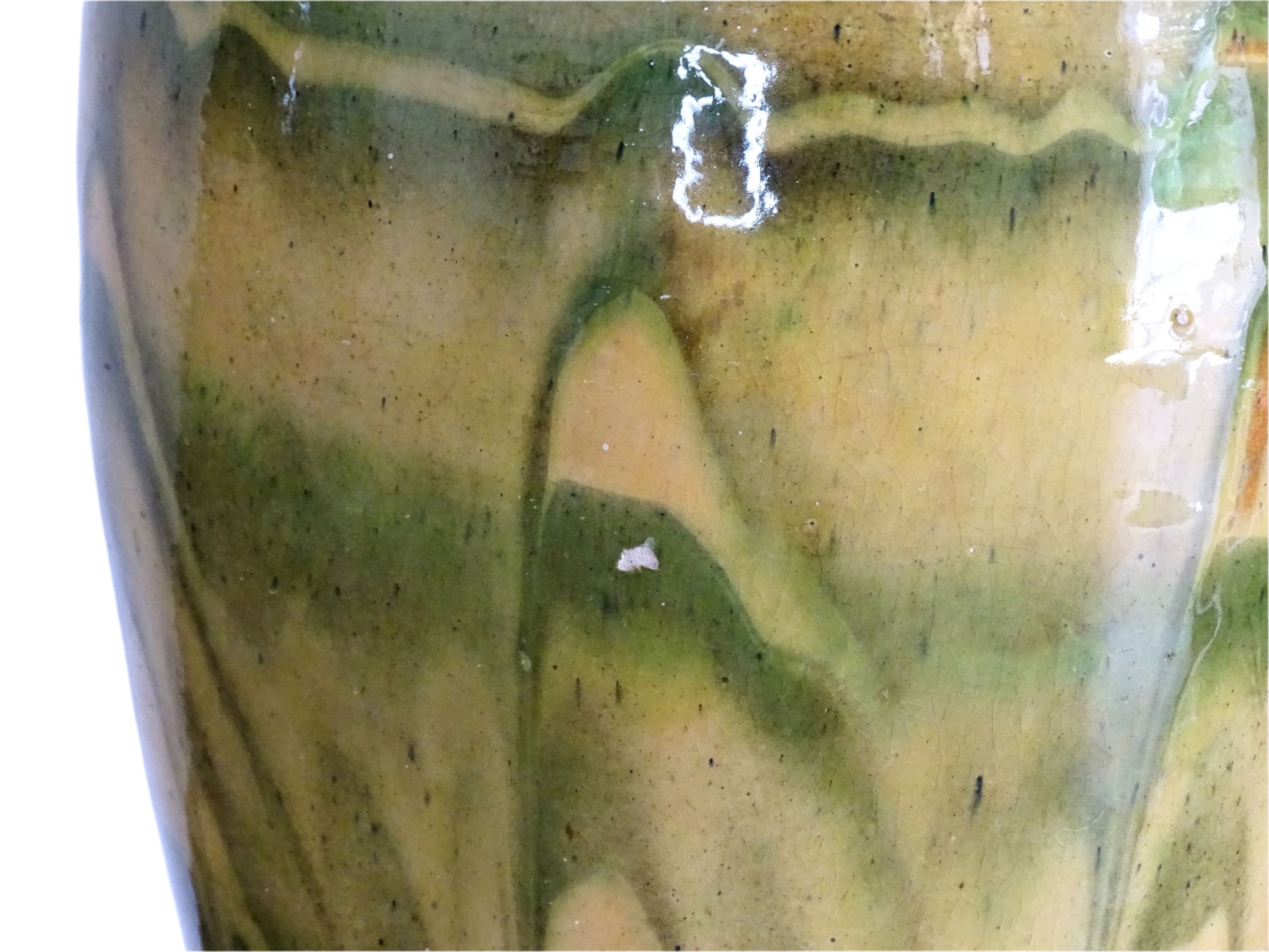 French Antique Terracotta Vase with Green and Yellow Glaze Details: