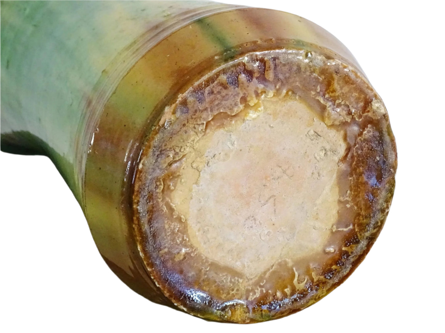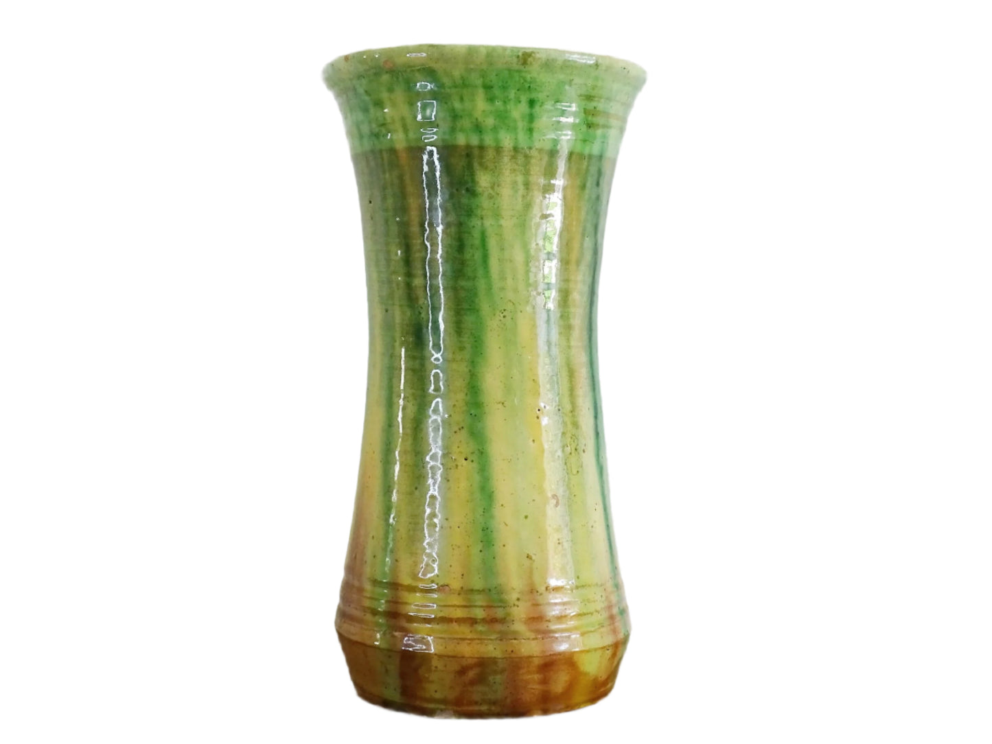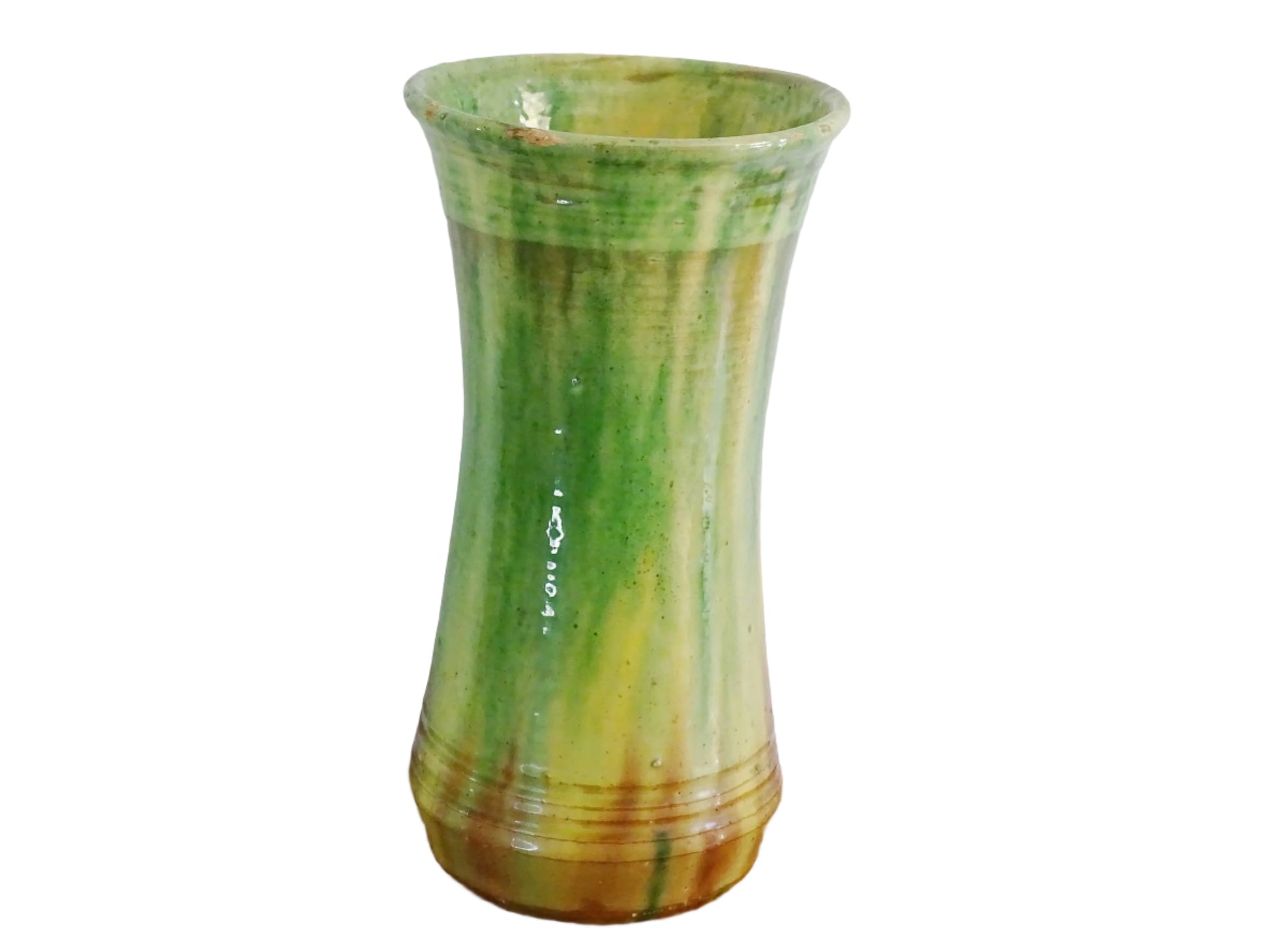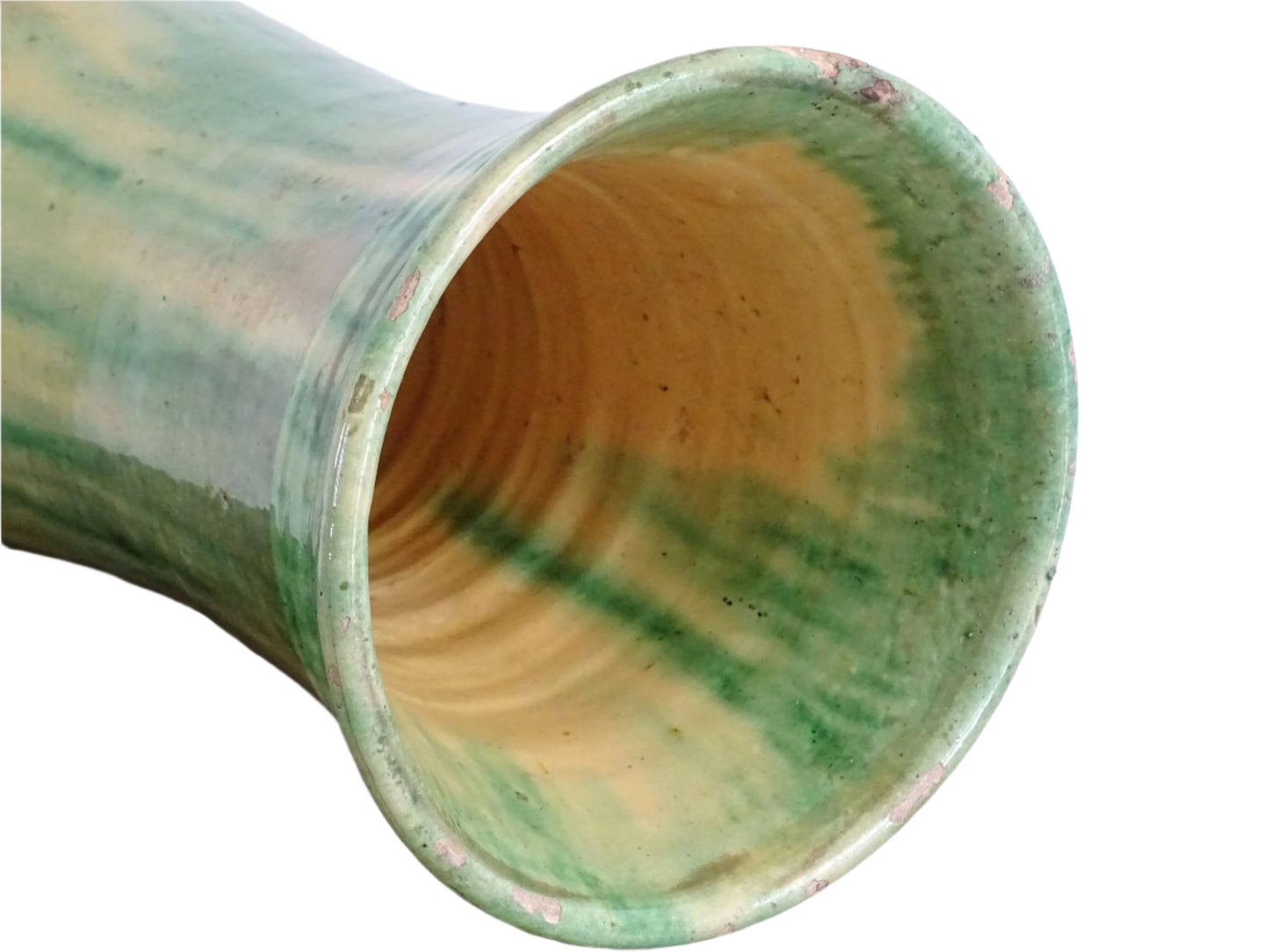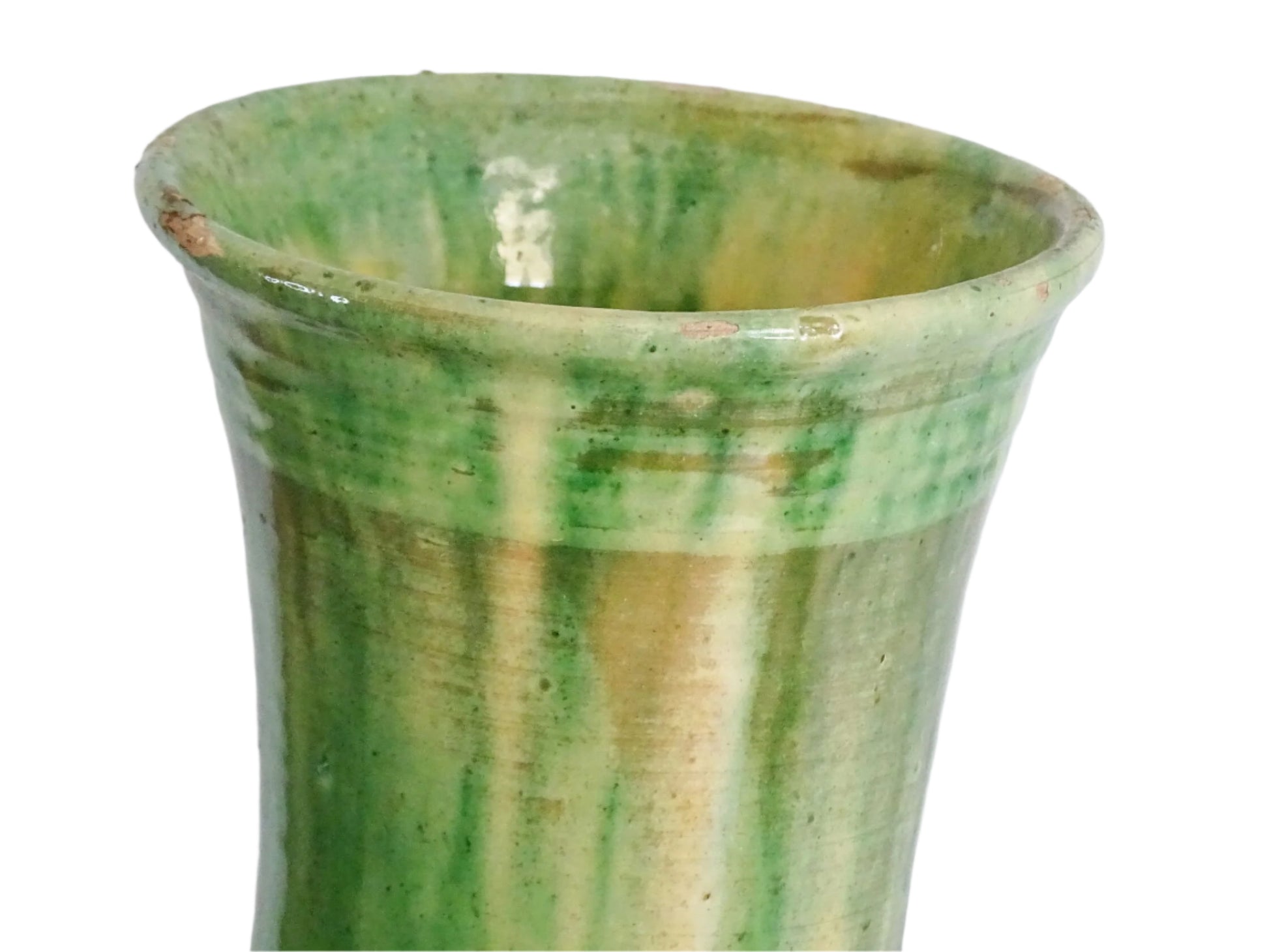 Beautiful French antique pottery vase from the town of Castelnaudary in South West France. Crafted from terracotta, it features a distinctive flared shape and a beautiful glaze in shades of green, yellow, and earthy brown. The dripping glaze effect adds depth and character. Use it as a statement piece on a console or dining table to bring a touch of French countryside charm.