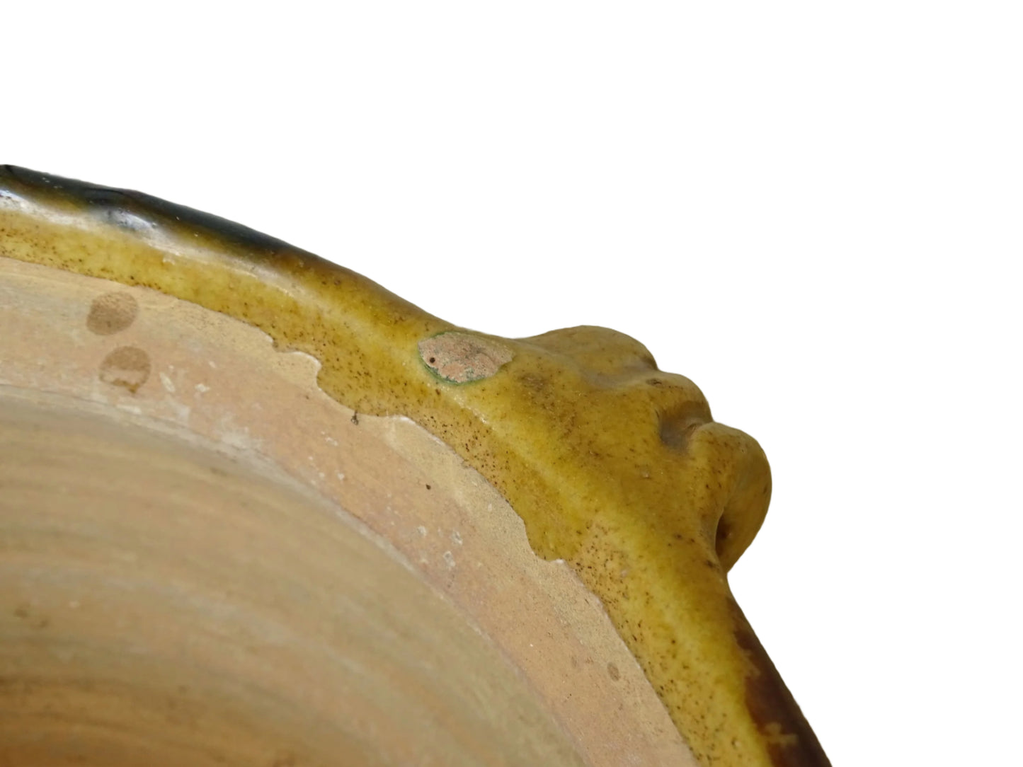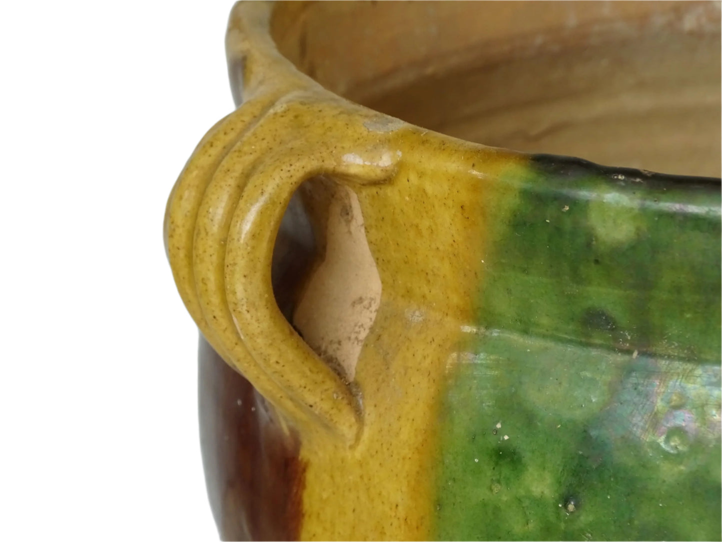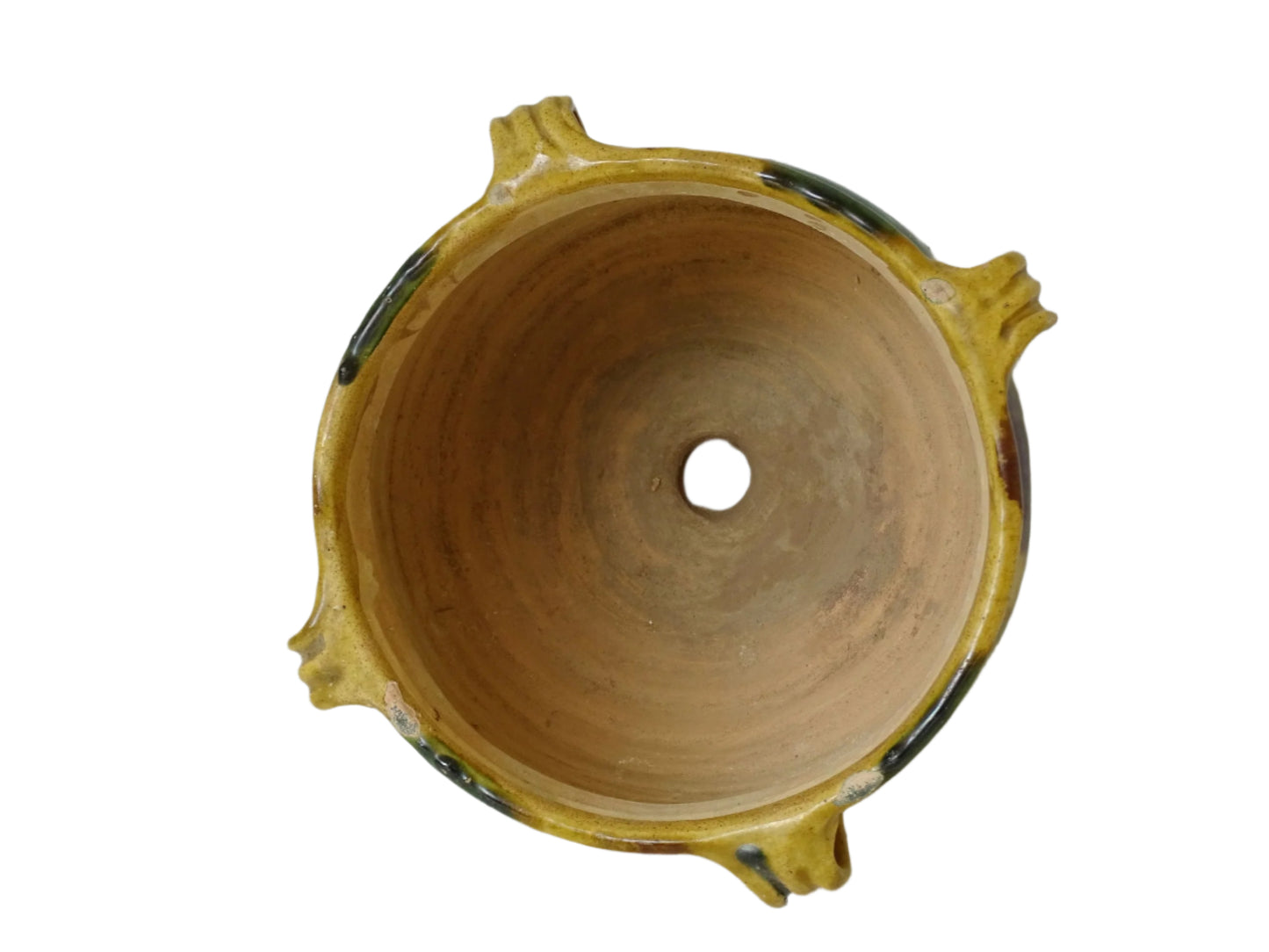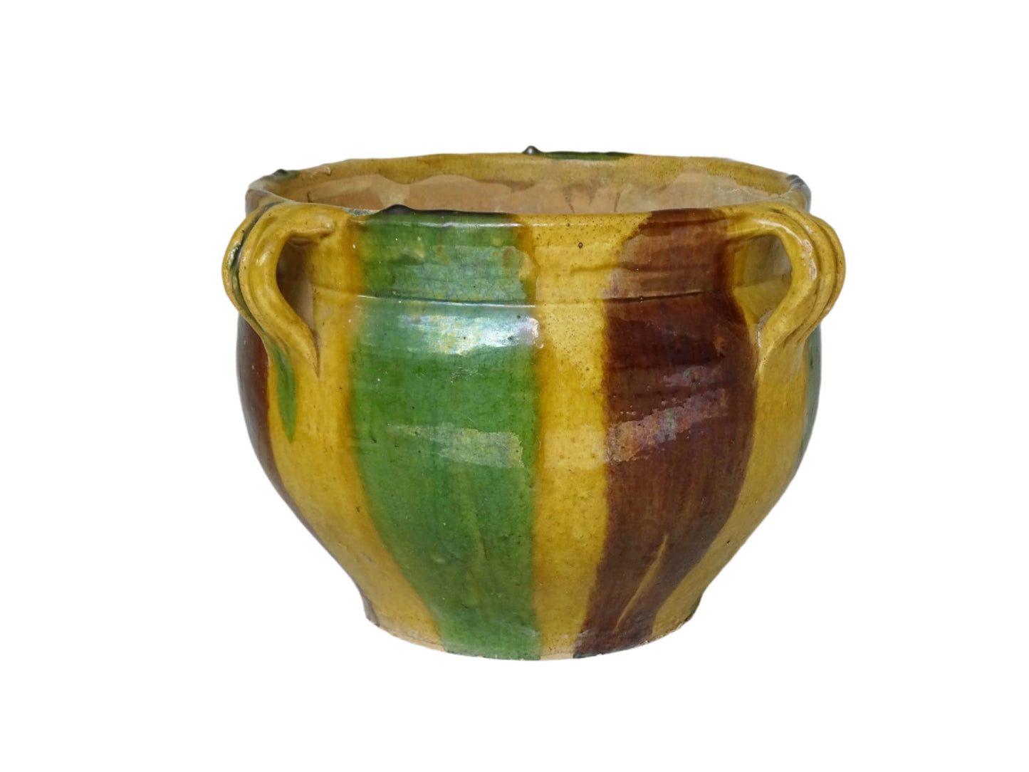 French antique terracotta planter from Castelnaudary. The 19th century jardinière has a stripe drip glaze in yellow, green and brown. This antique earthenware pot would make a beautiful decorative accent filled with a luscious green plant.