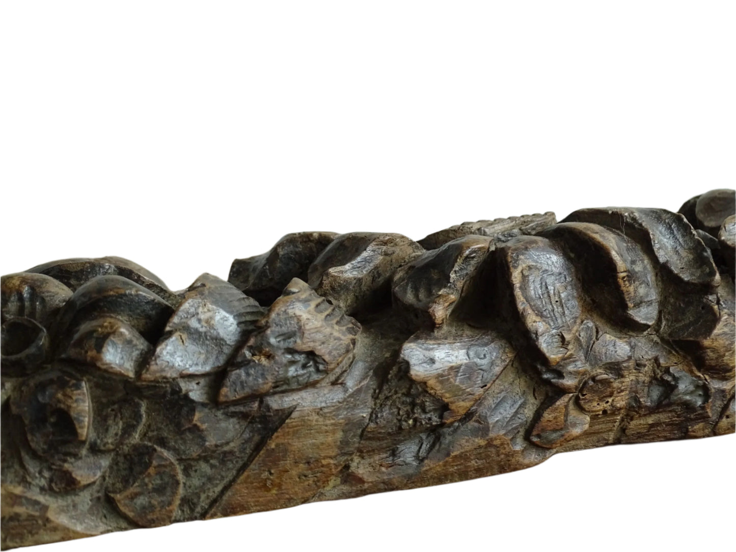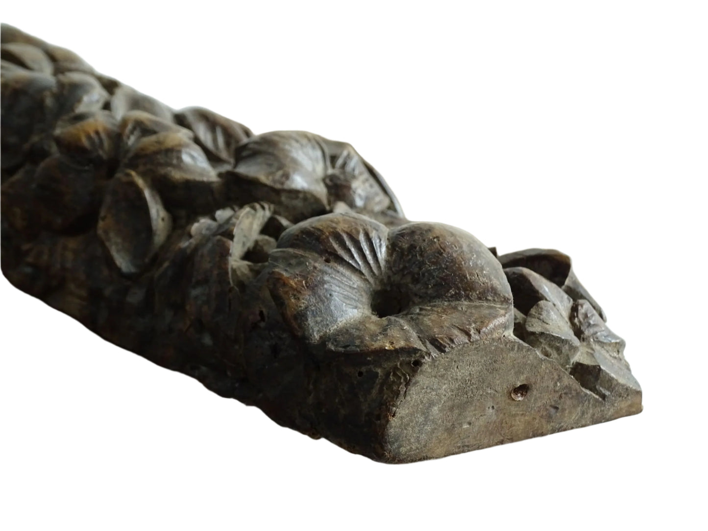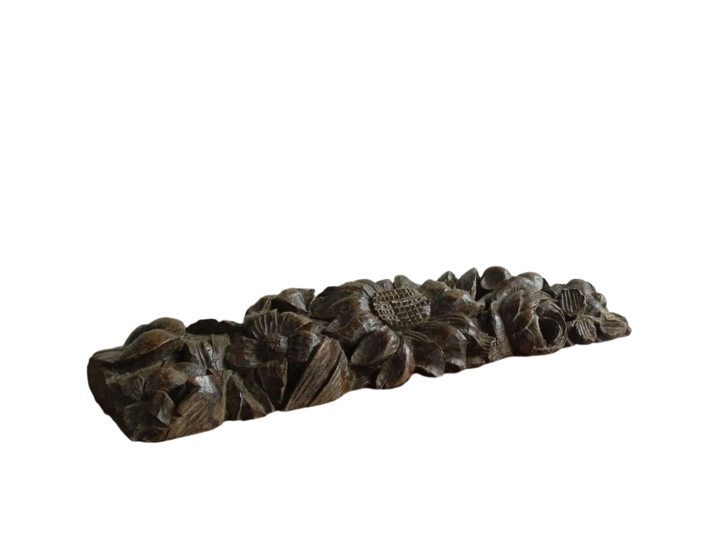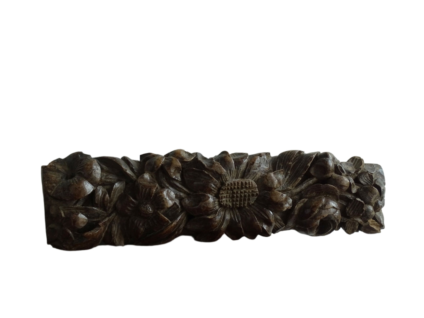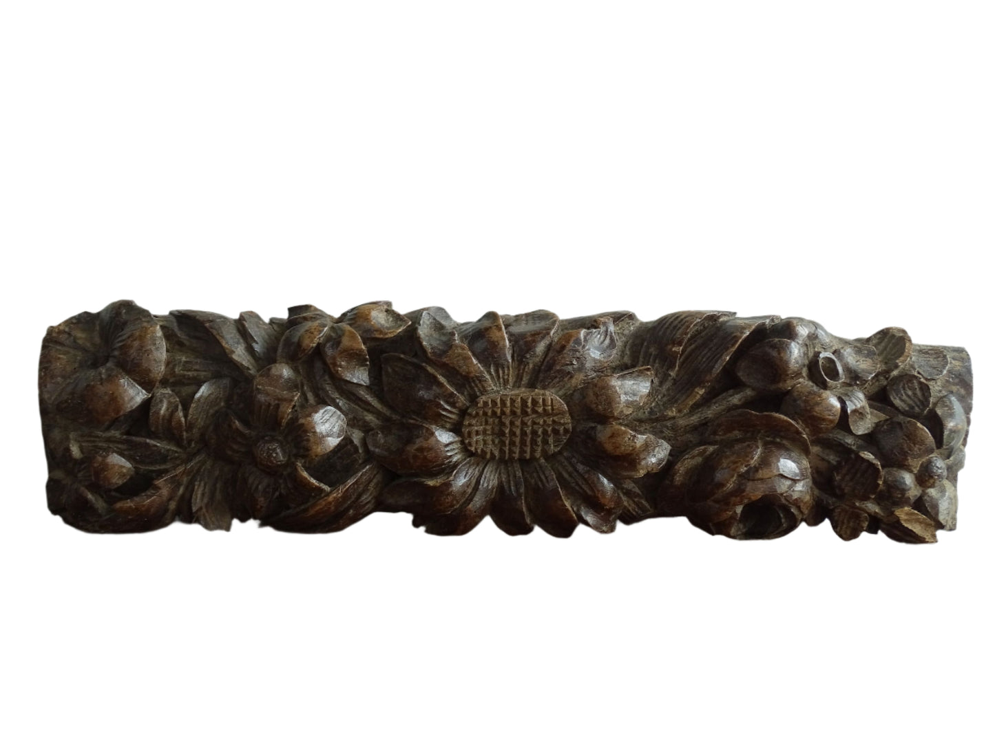 Beautifully detailed French antique wooden carving, possibly from a piece of furniture. It depicts sunflowers and roses. It would make a gorgeous decorative accent, perhaps display this wood carving with a collection of antique pieces as part of a vignette on a console table.