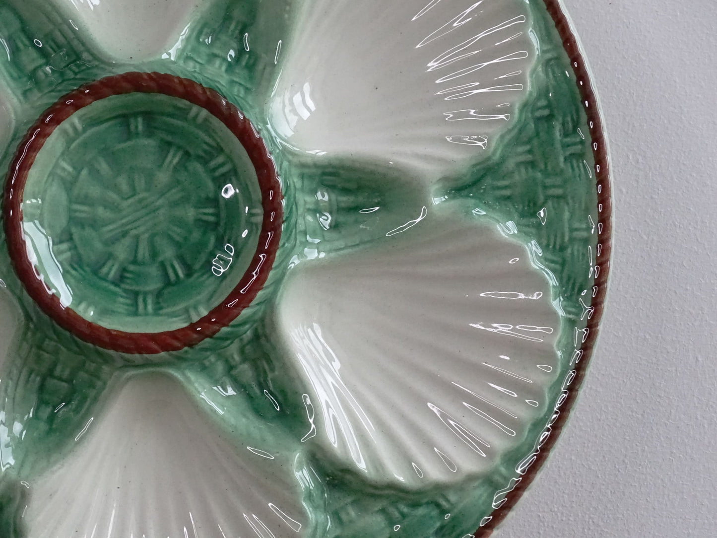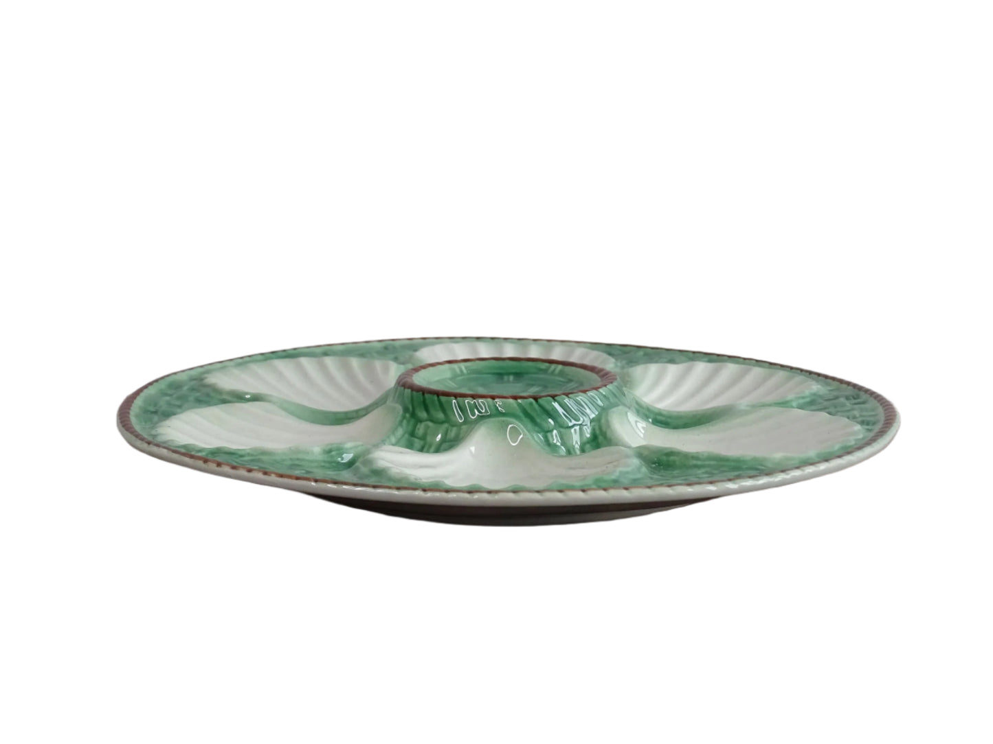 Beautiful French barbotine oyster plate with space for six oysters, dating to around the 1930s. It has a green, basketweave design with a brown edging. These barbotine or majolica plates would make perfect French dinnerware or displayed in a kitchen dresser.