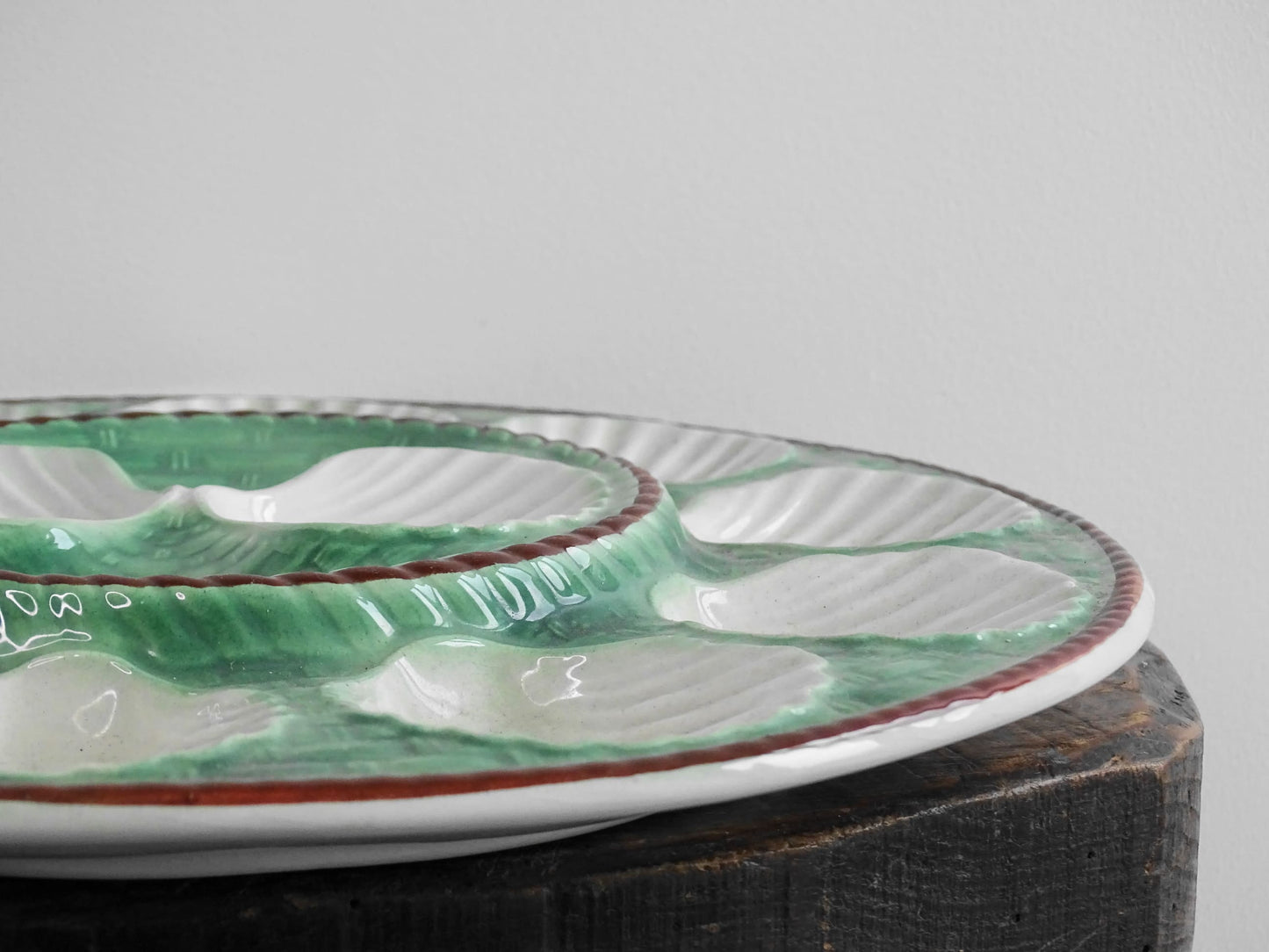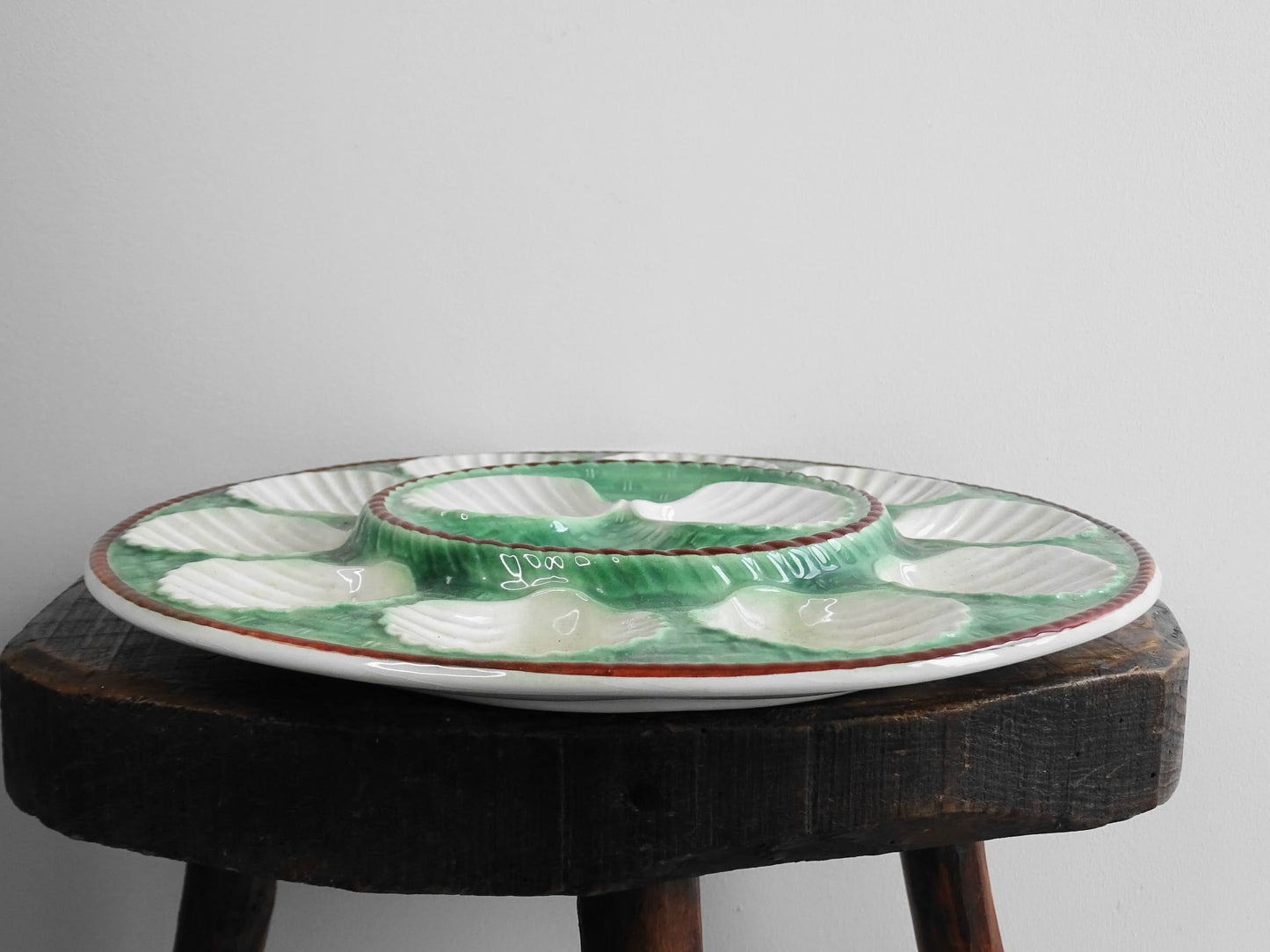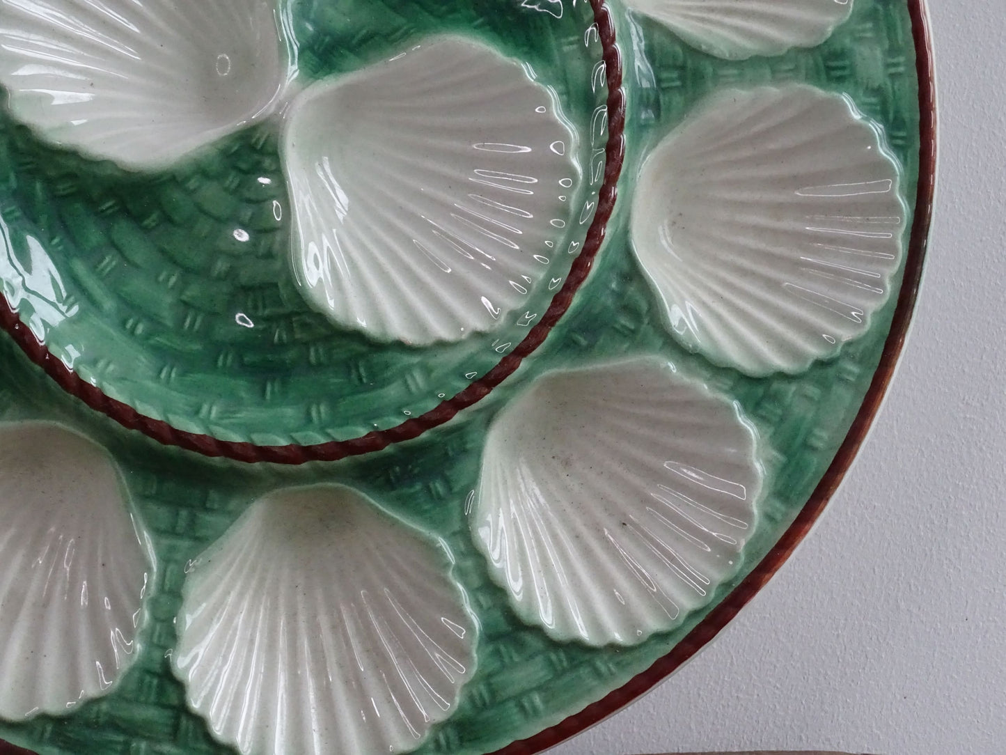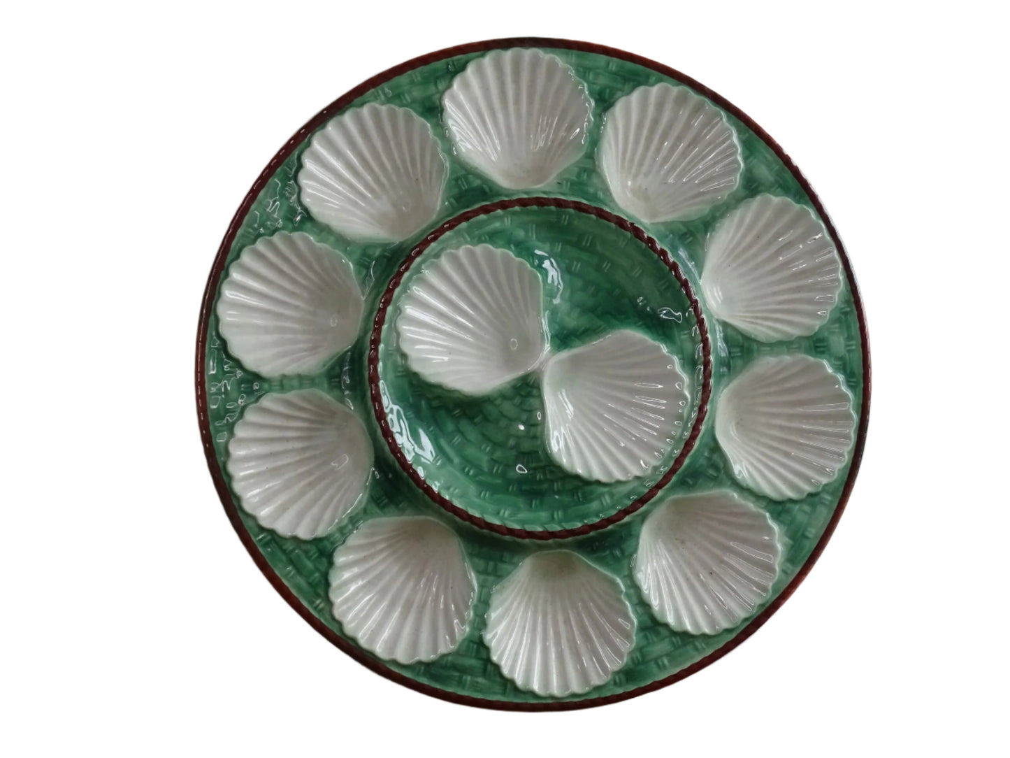 Beautiful French barbotine oyster serving plate with space for twelve oysters, dating to around the 1930s. It has a green, basketweave design with a brown edge. It could be used as a magnificent serving platter in the centre of the dining table, alternatively it could be wall decor or make a beautiful display in a kitchen dresser.