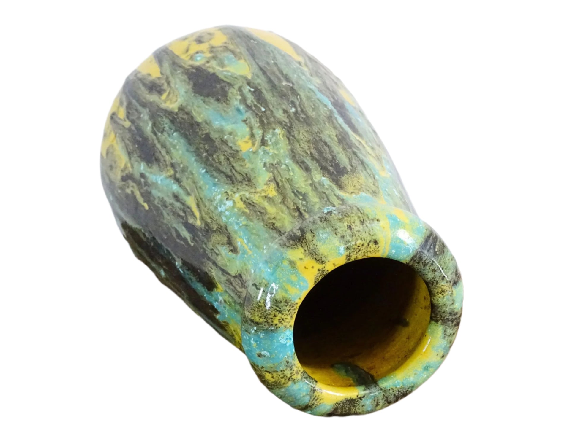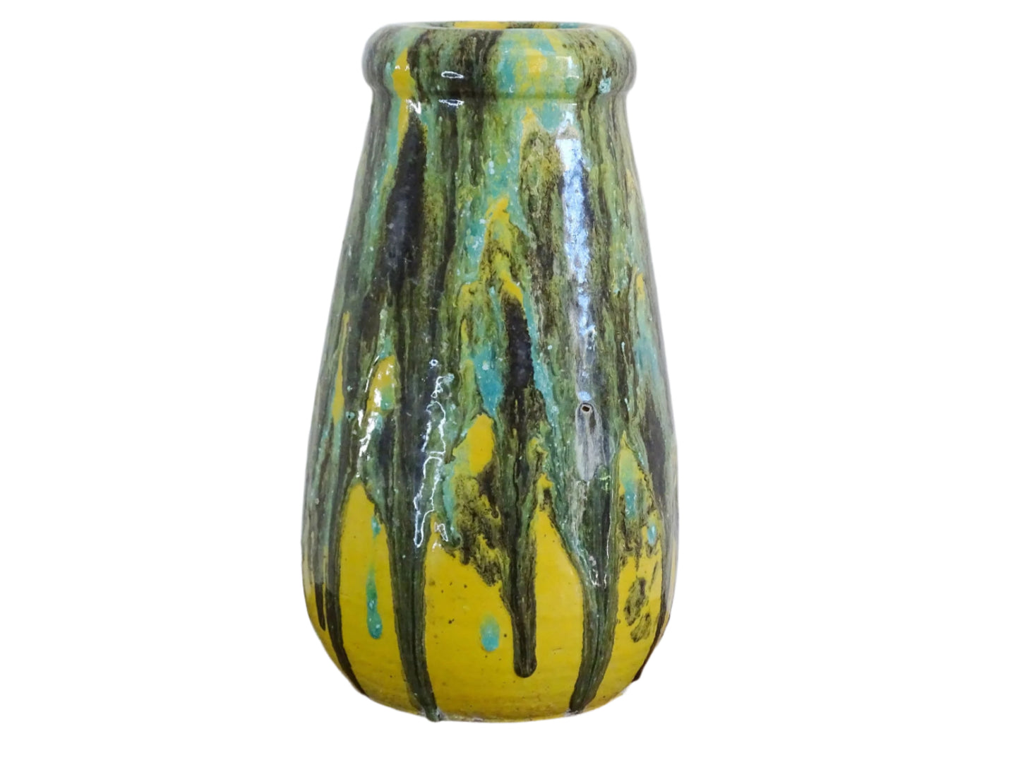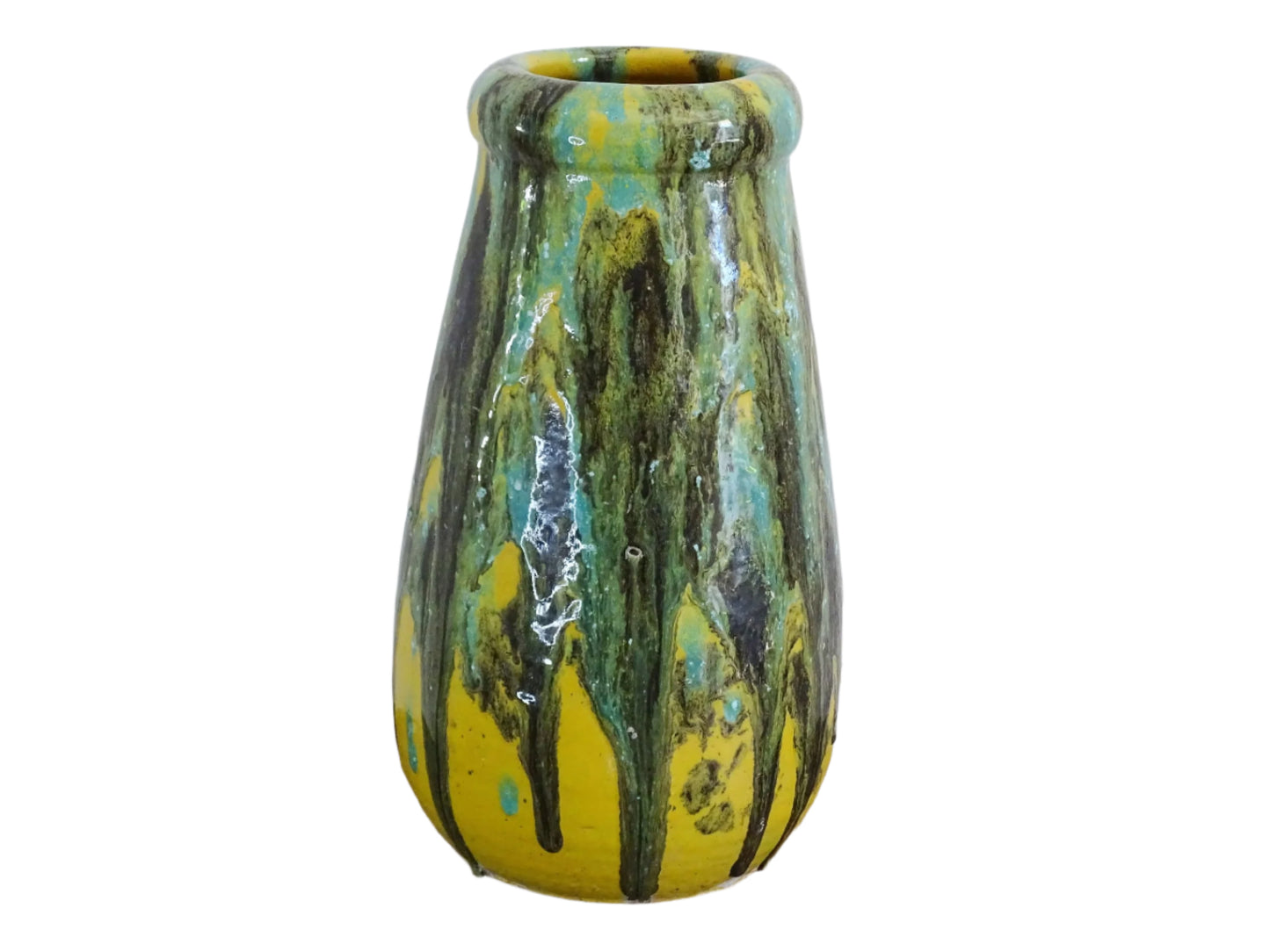 Stunning French vintage ceramic vase glazed in yellow with a green and pale blue drip glaze giving it an almost volcanic effect. This beautiful tall terracotta vase would make a gorgeous decoration, both filled with stems or standing by itself.