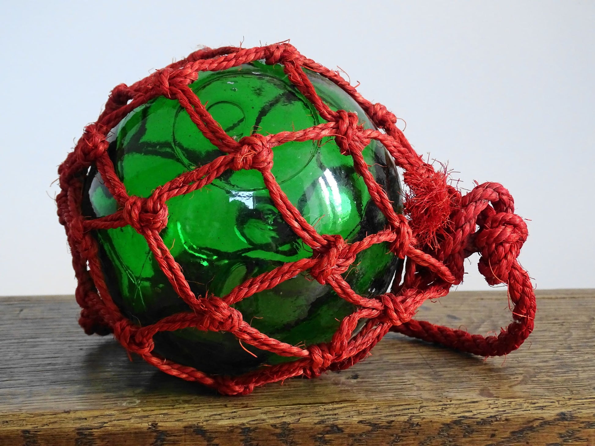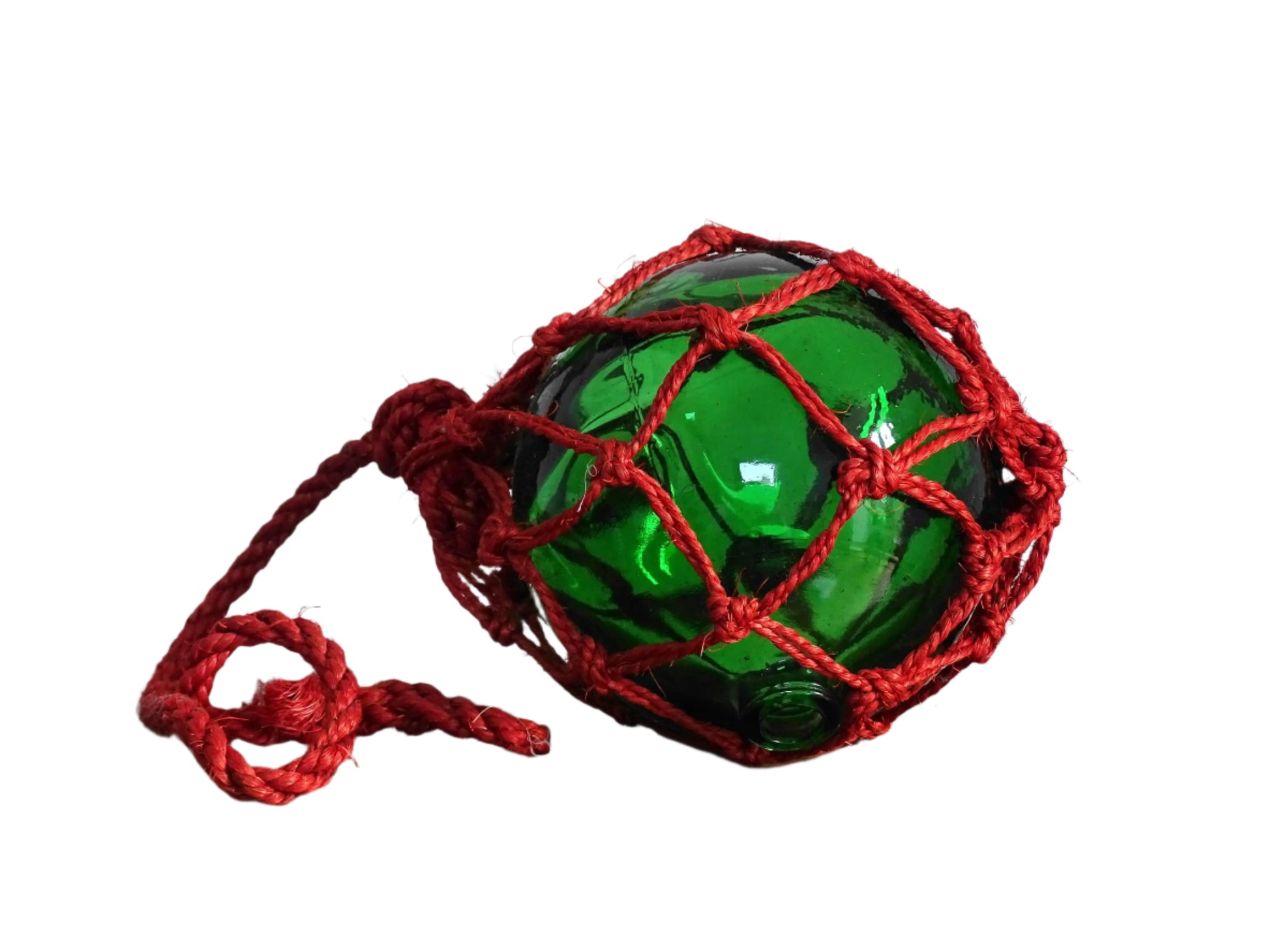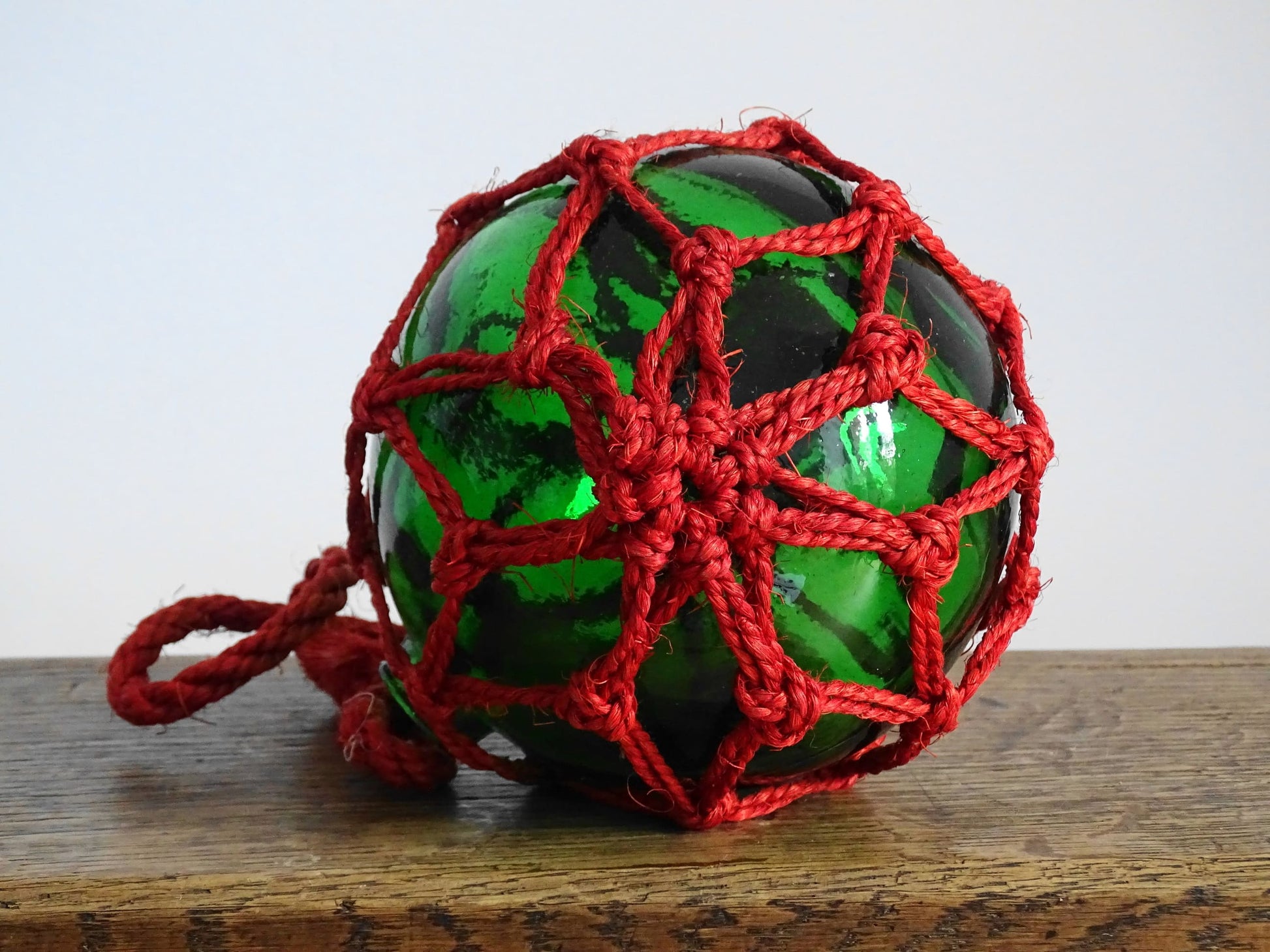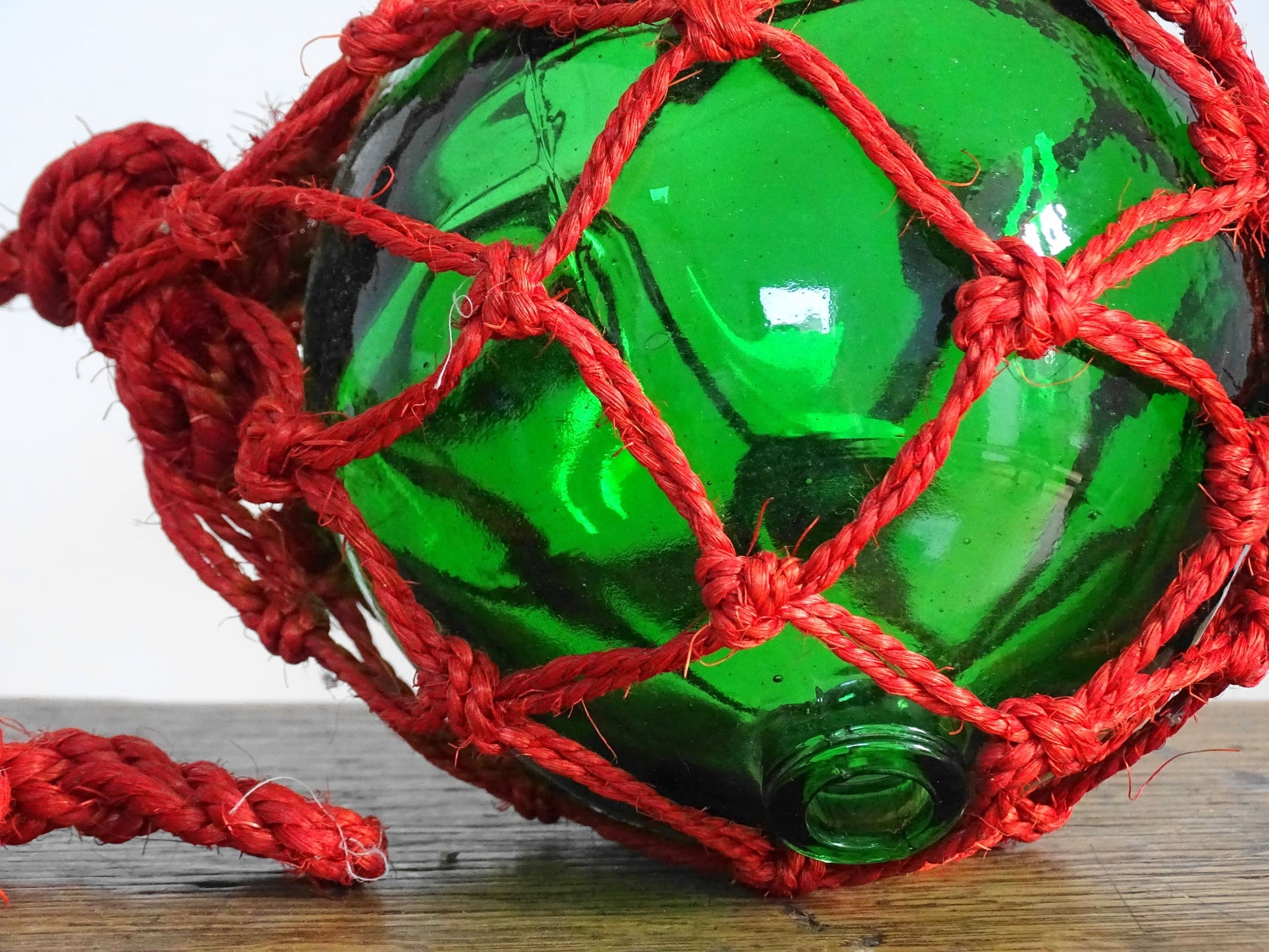 French vintage glass fishing float in a deep green glass, netted in a red rope. These glass buoys were used to mark fishing nets or lobster traps and now make gorgeous vintage home accents. Display a collection of these decorative glass buoys in a large rustic bowl as a table centrepiece or hang in a window to catch the sunlight.