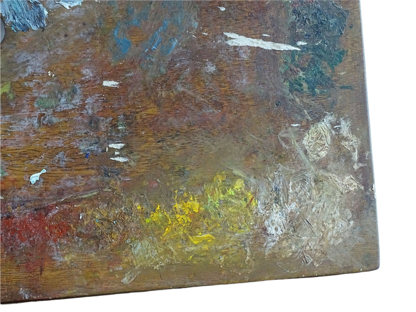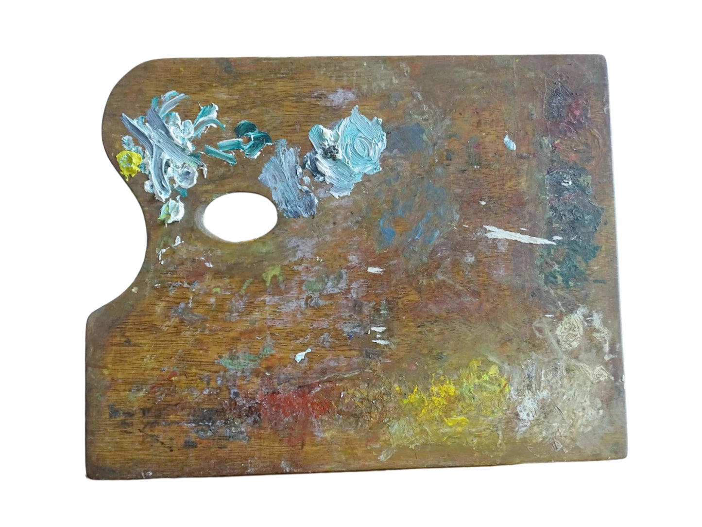French vintage paint palette, with remnants of vibrant, textured paint, offering a unique glimpse into an artist's creative process. The worn wood and rich tones make it an evocative decorative piece.