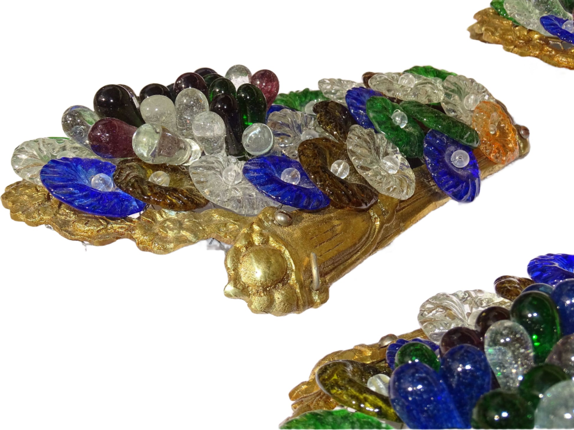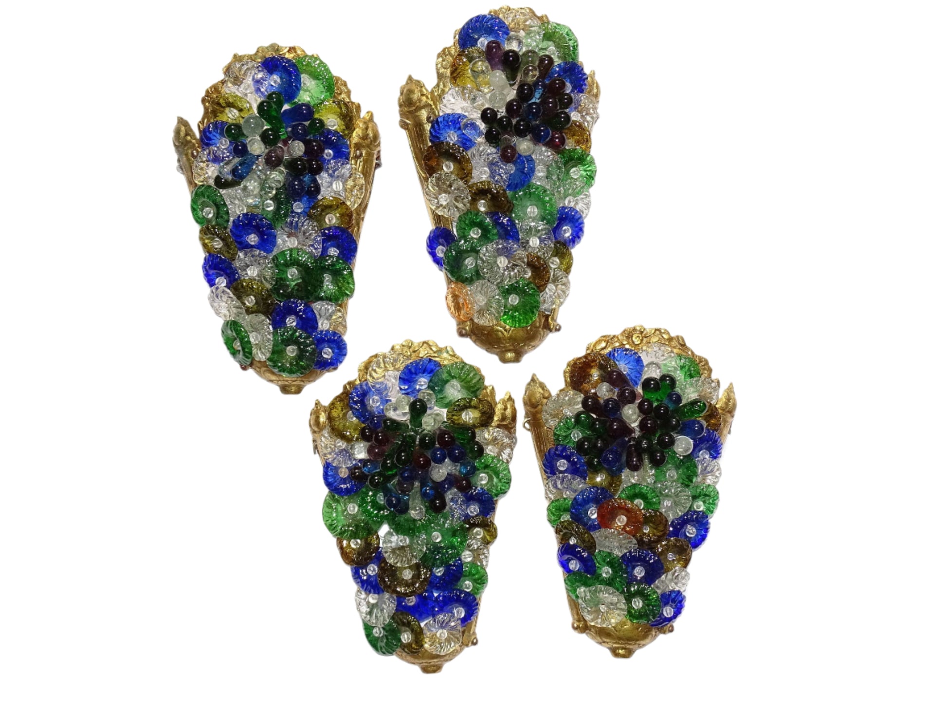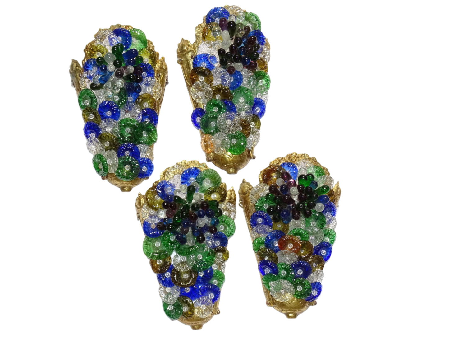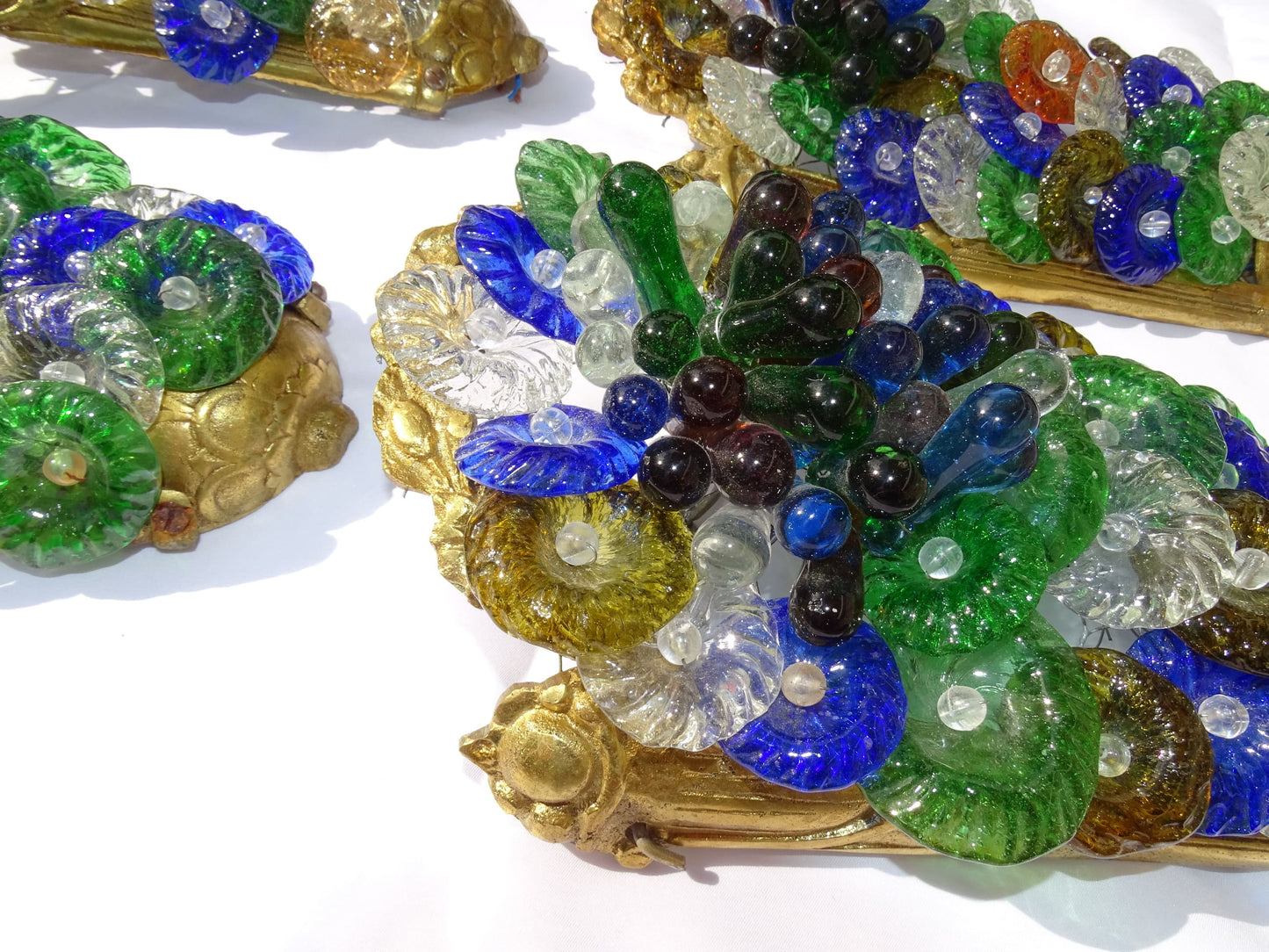 A decorative set of four vintage Murano glass wall lights from Italy. Each sconce features a mix of colourful hand-blown glass pieces in green, blue, amber, clear and deep purple tones, arranged in a raised floral-style pattern. The lights have beautiful ornate gilt metal surrounds with a scrolling form.