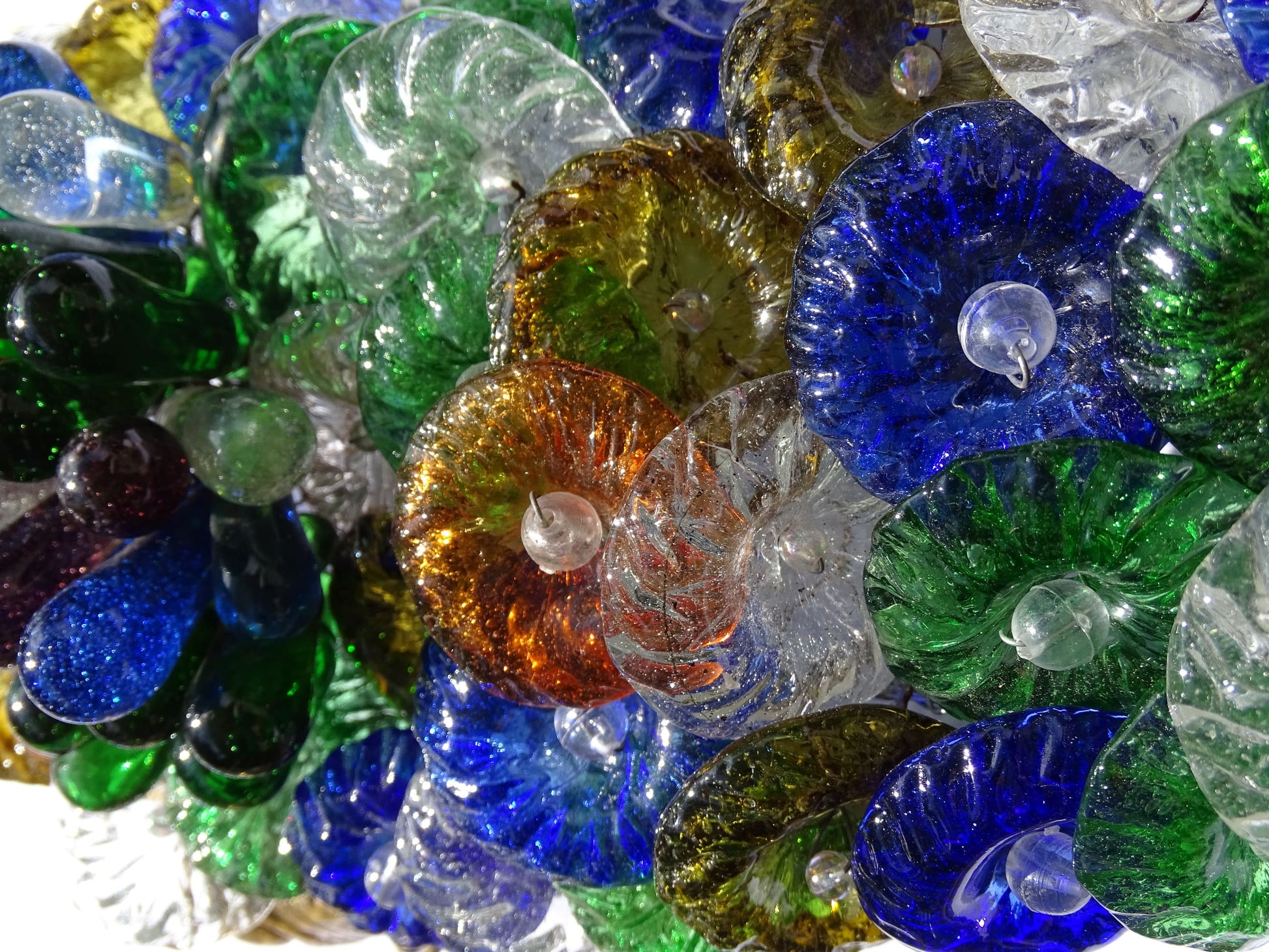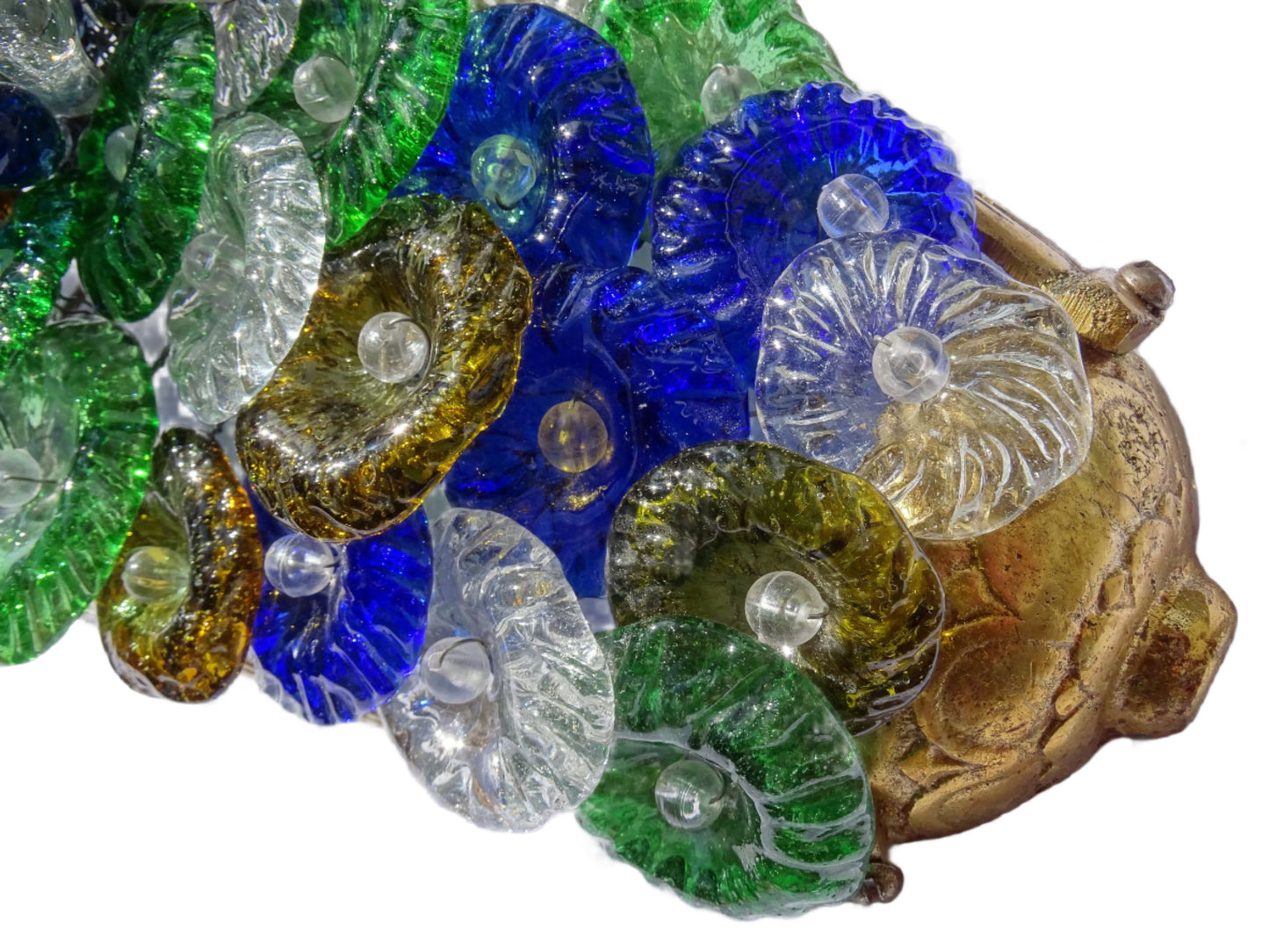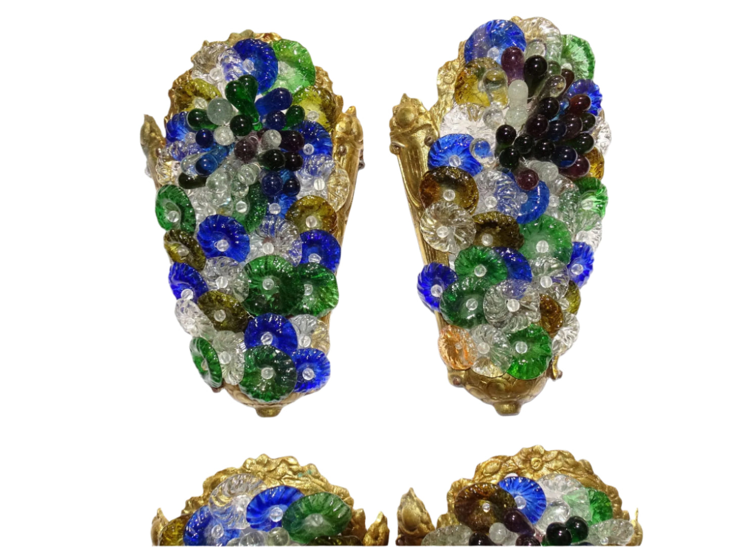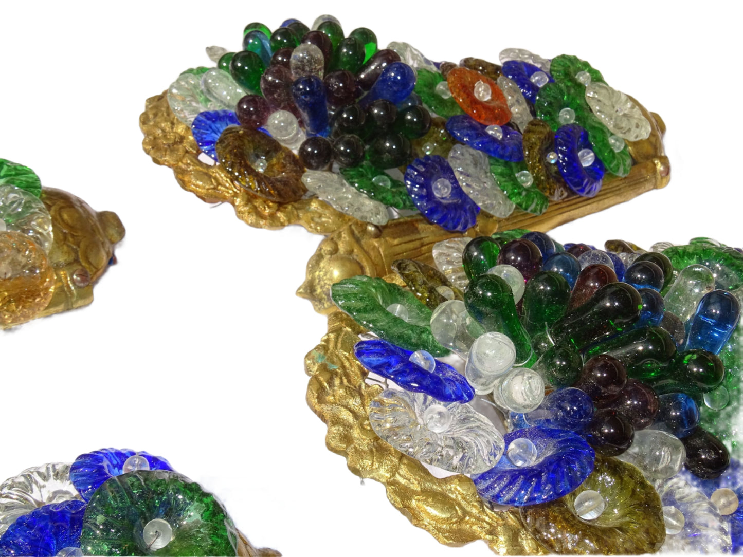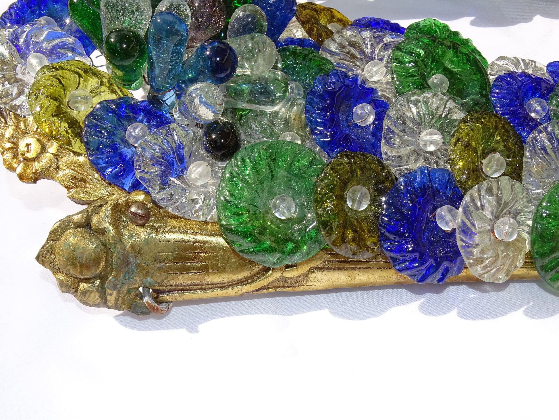 A decorative set of four vintage Murano glass wall lights from Italy. Each sconce features a mix of colourful hand-blown glass pieces in green, blue, amber, clear and deep purple tones, arranged in a raised floral-style pattern. The lights have beautiful ornate gilt metal surrounds with a scrolling form.