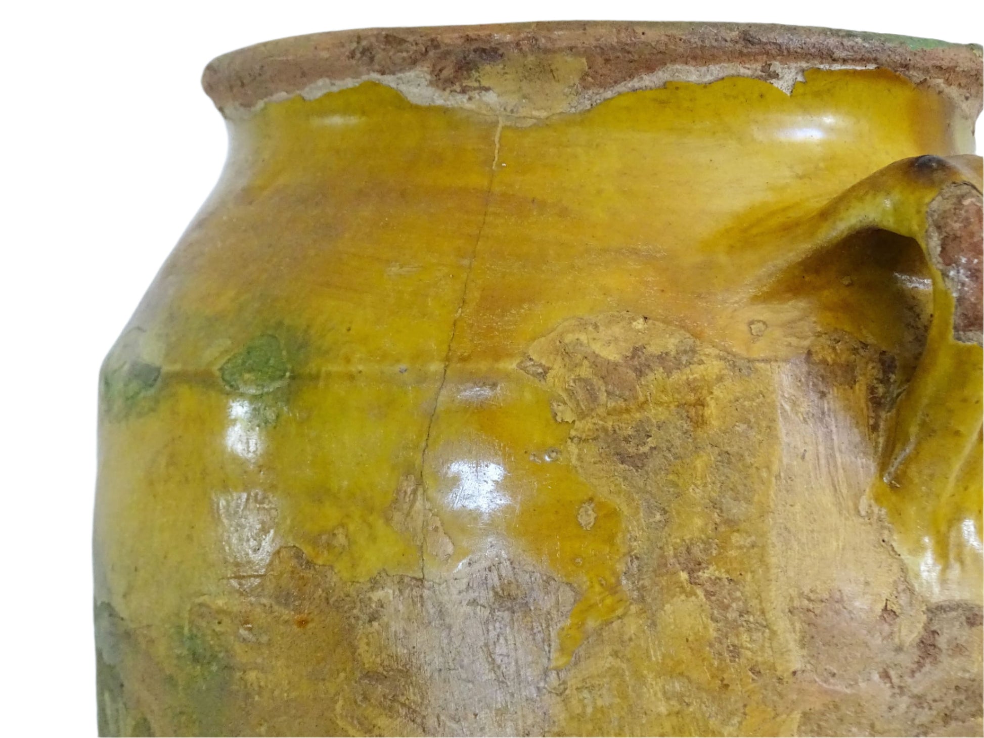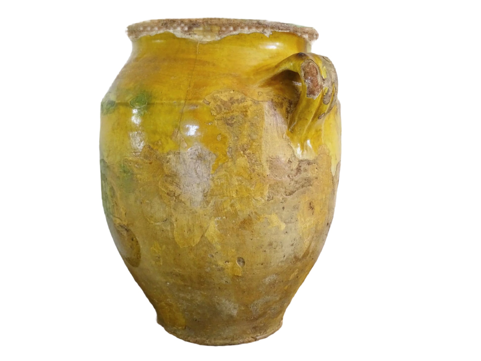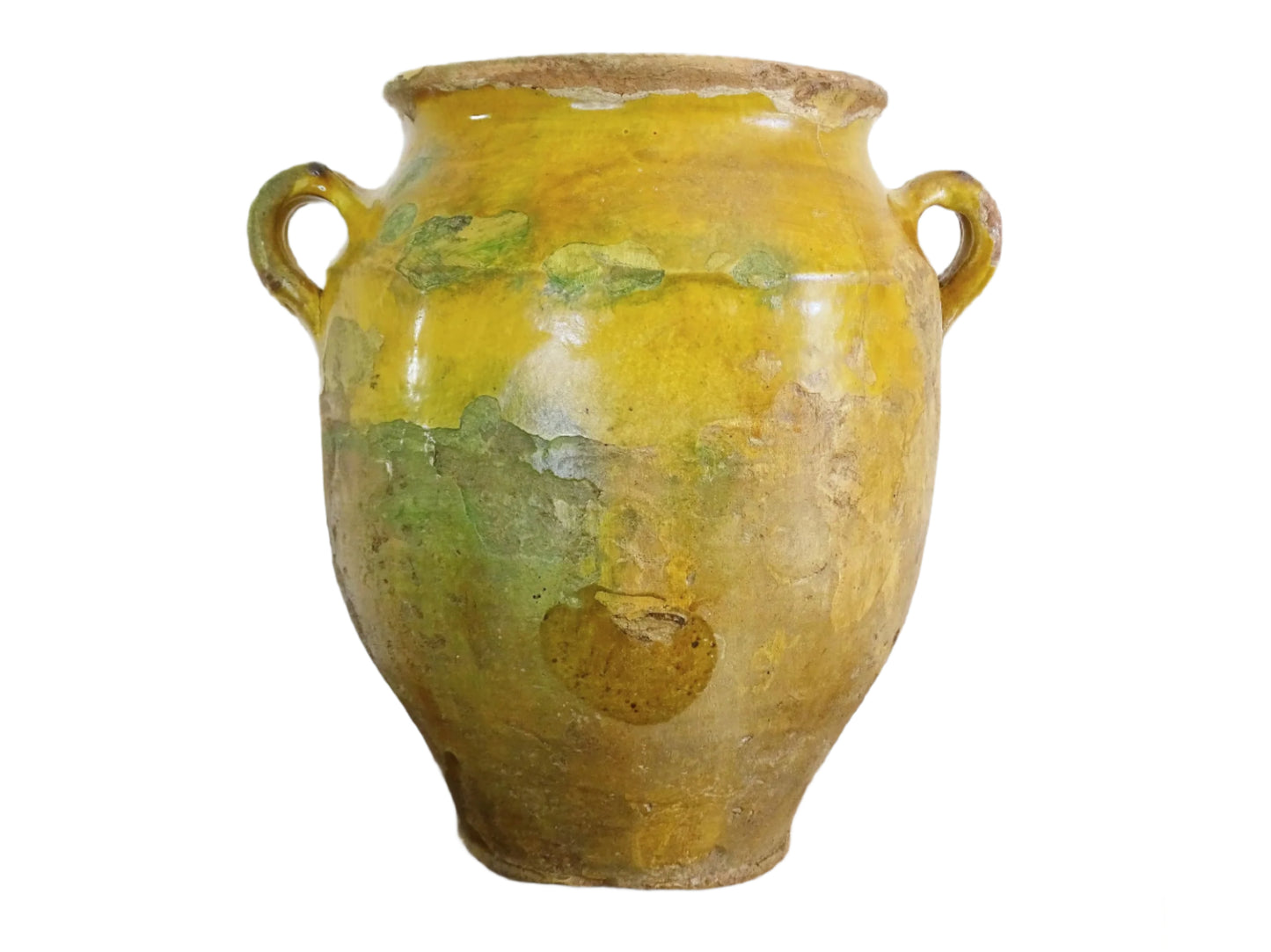 Large antique French confit pot with yellow glaze. Originally used to preserve meats in the South of France, the terracotta has a rich patina and has touches of green over the mustard yellow. This confit jar would look beautiful placed on console table or kitchen counter, fill it with dried flowers or display with a collection of pots.