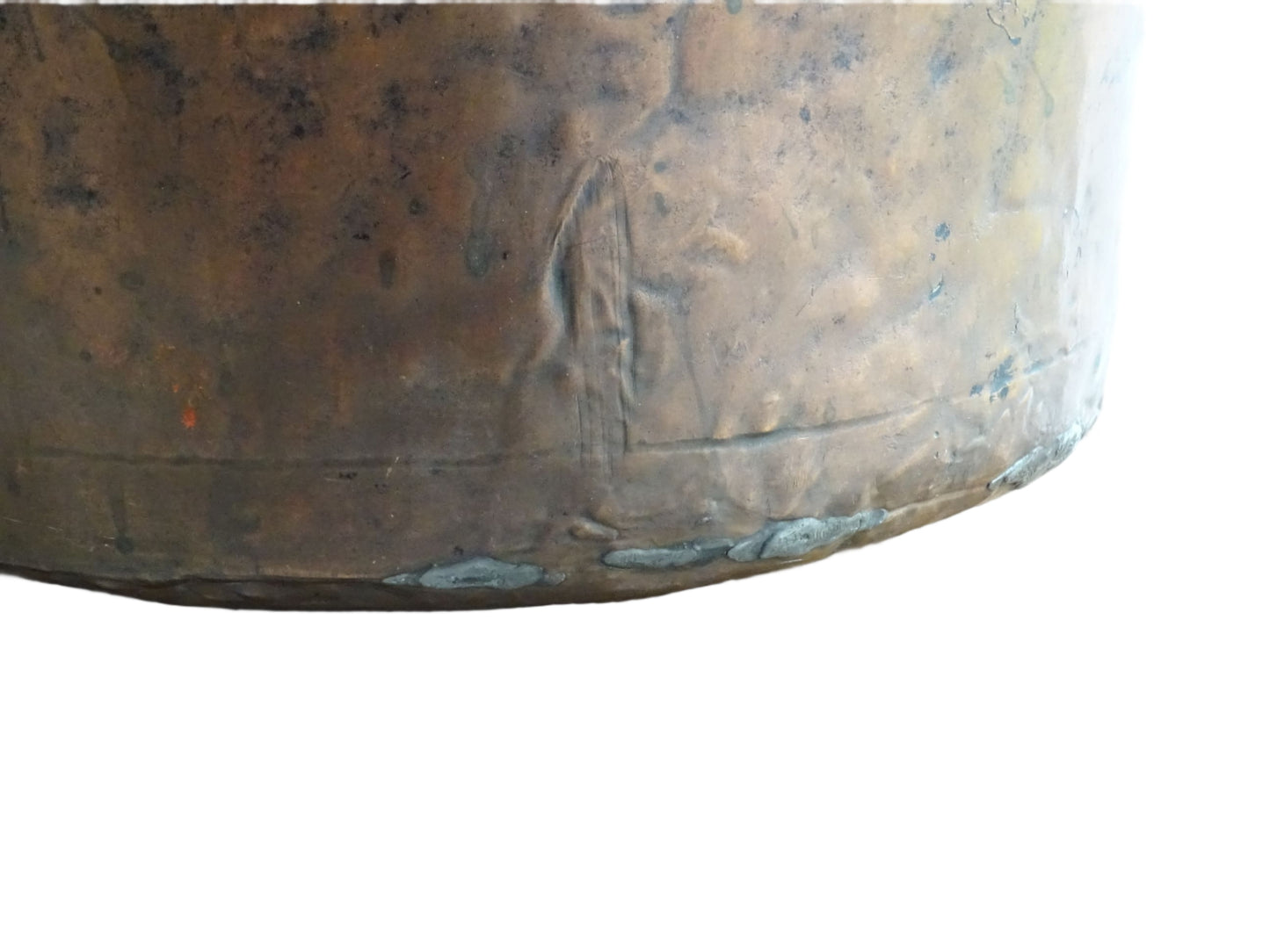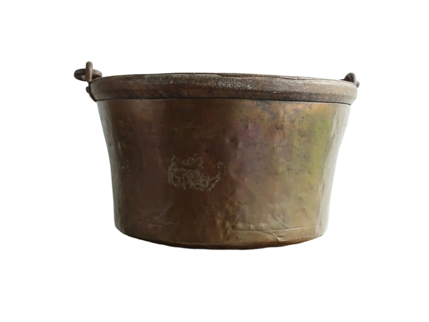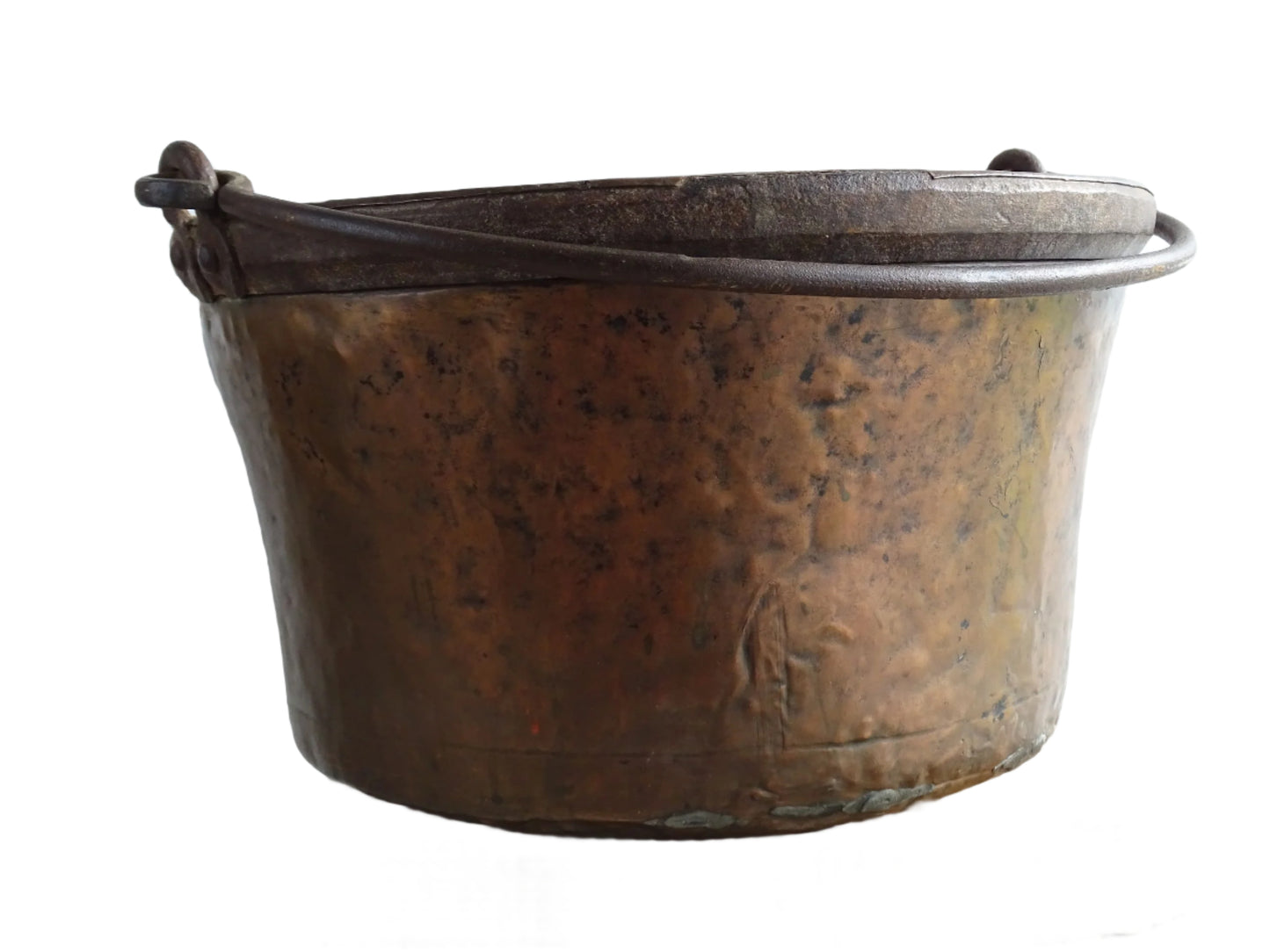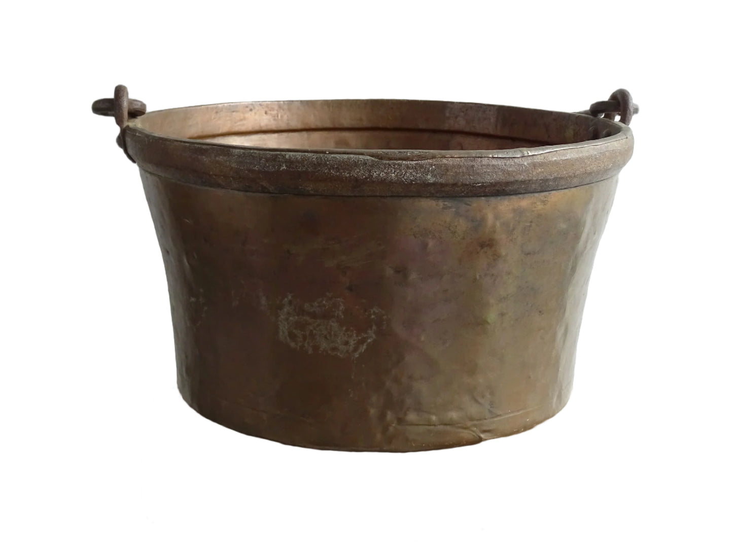 Large antique French copper cauldron with wrought iron handle. Its generous size make it perfect for creative displays. Fill the cauldron with dried flowers or use it as an indoor planter. Alternatively, use it to add character to your entryway.