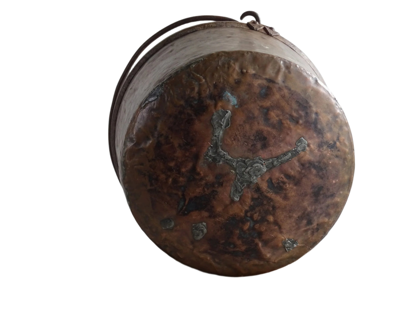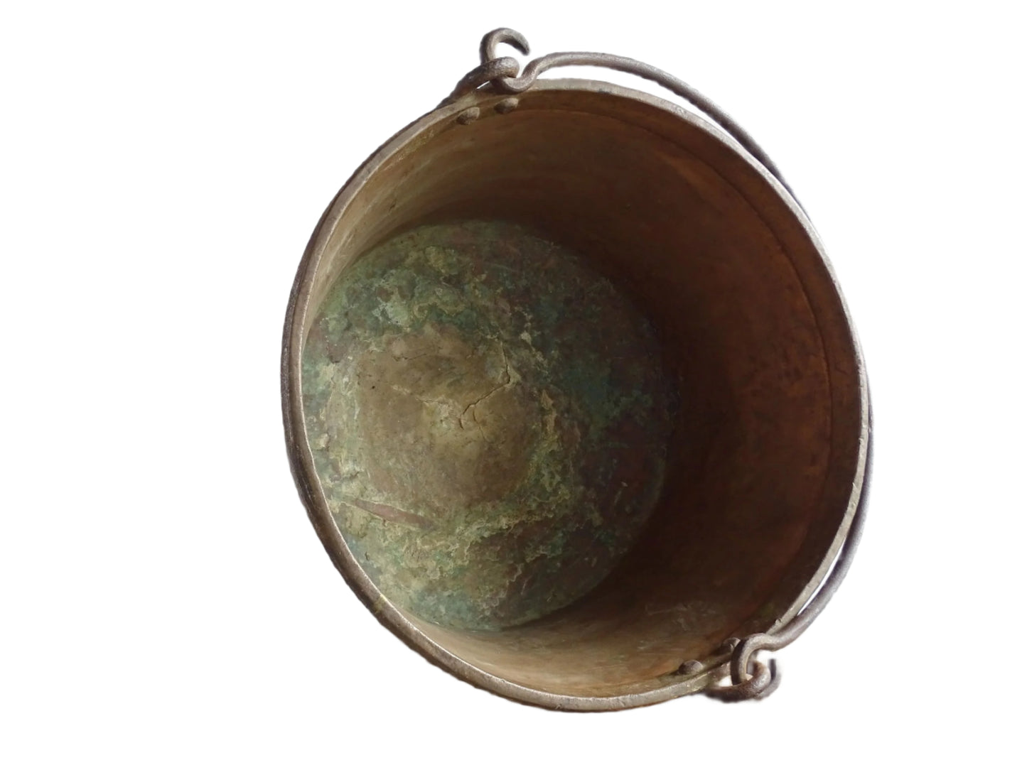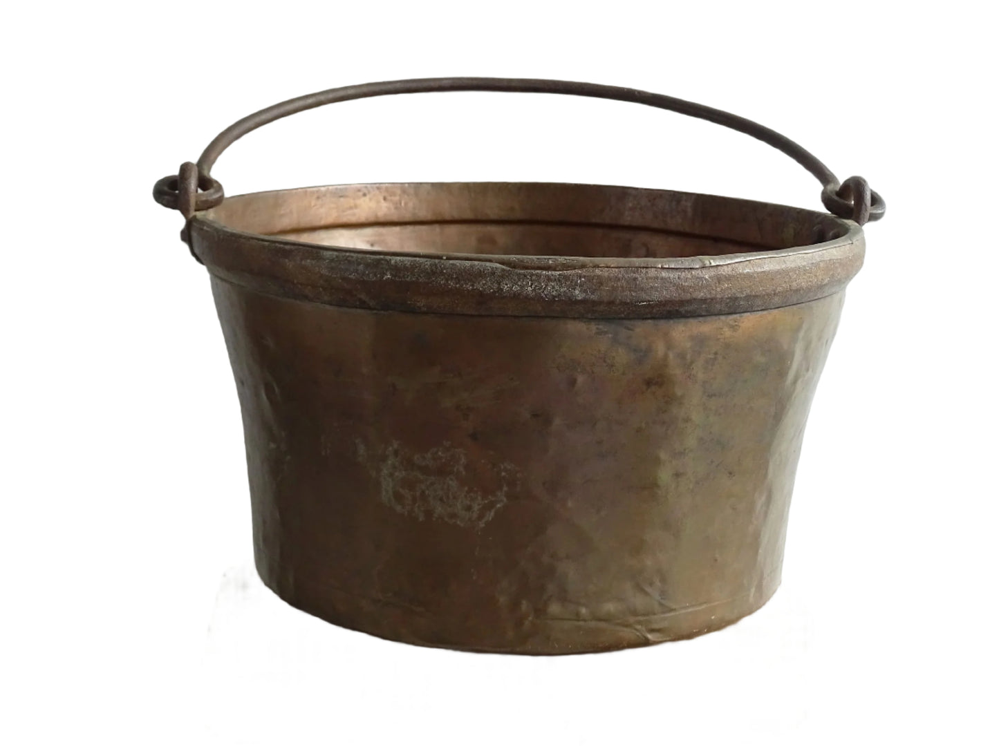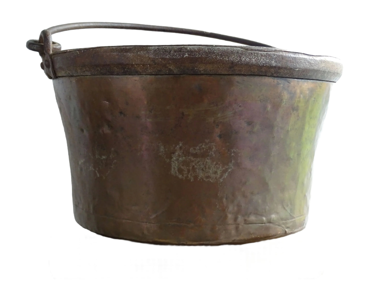 Large antique French copper cauldron with wrought iron handle. Its generous size make it perfect for creative displays. Fill the cauldron with dried flowers or use it as an indoor planter. Alternatively, use it to add character to your entryway.