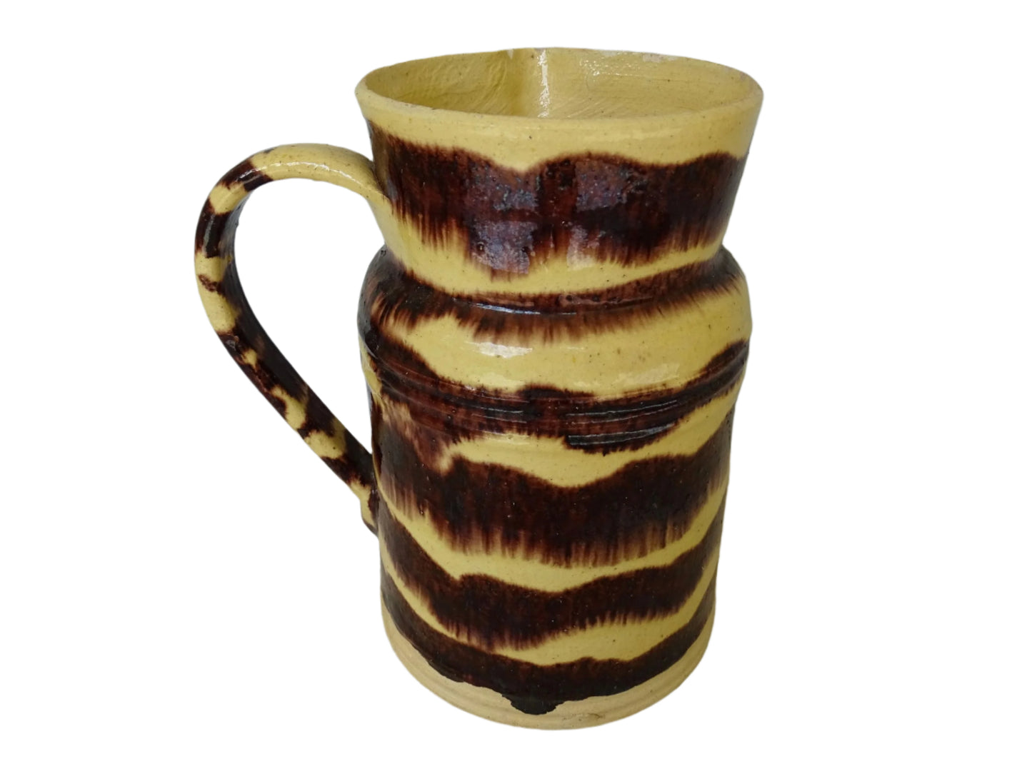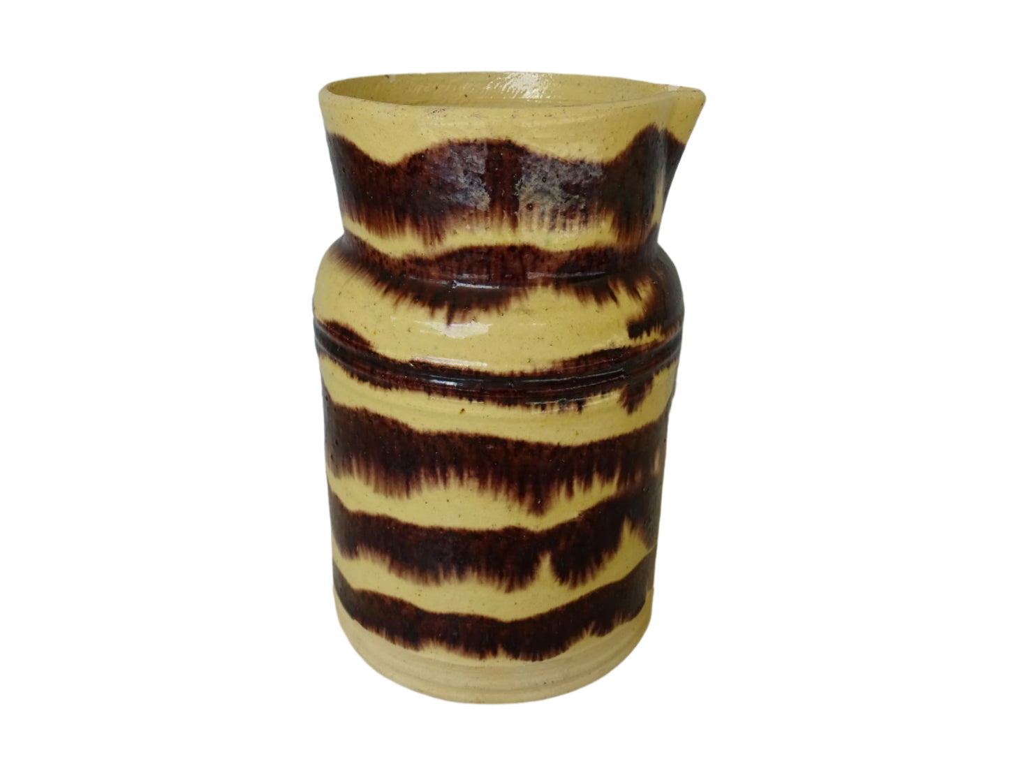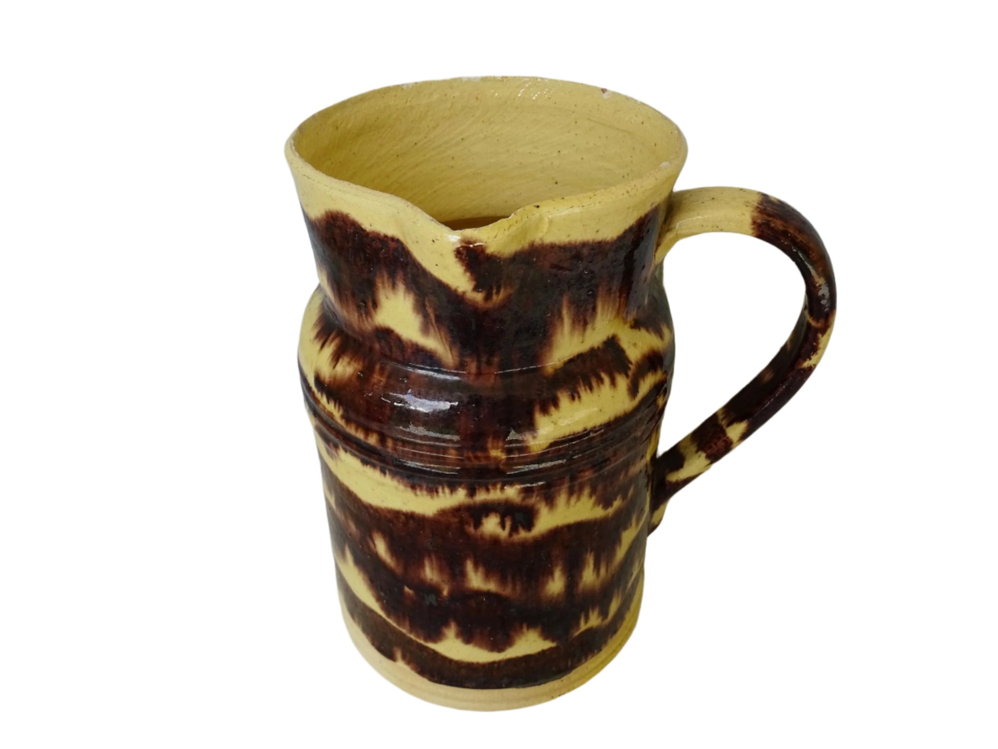 Large French antique ceramic pitcher with yellow glaze and brown drip glaze detailing. This pottery jug, with a handle to the side, is from the town of Dieulefit in the department of Drôme. Originally used for cooking, it could now be filled with flowers to decorate the middle of a farmhouse kitchen table.