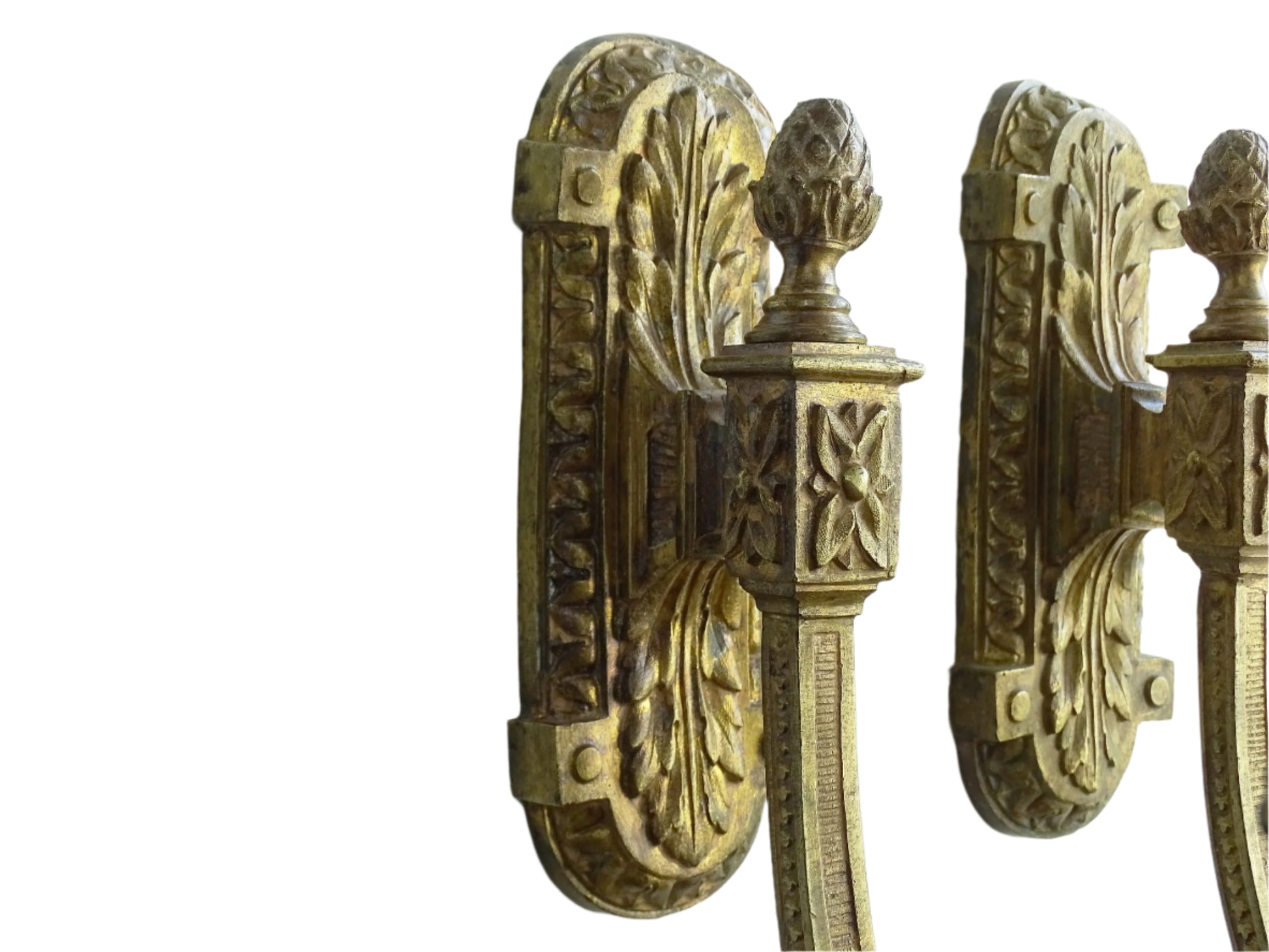 Magnificent pair of French antique curtain hooks in gilt bronze with intricate detailing. These empire style hooks feature intricate acanthus leaf motifs, acorn finials and architectural elements.