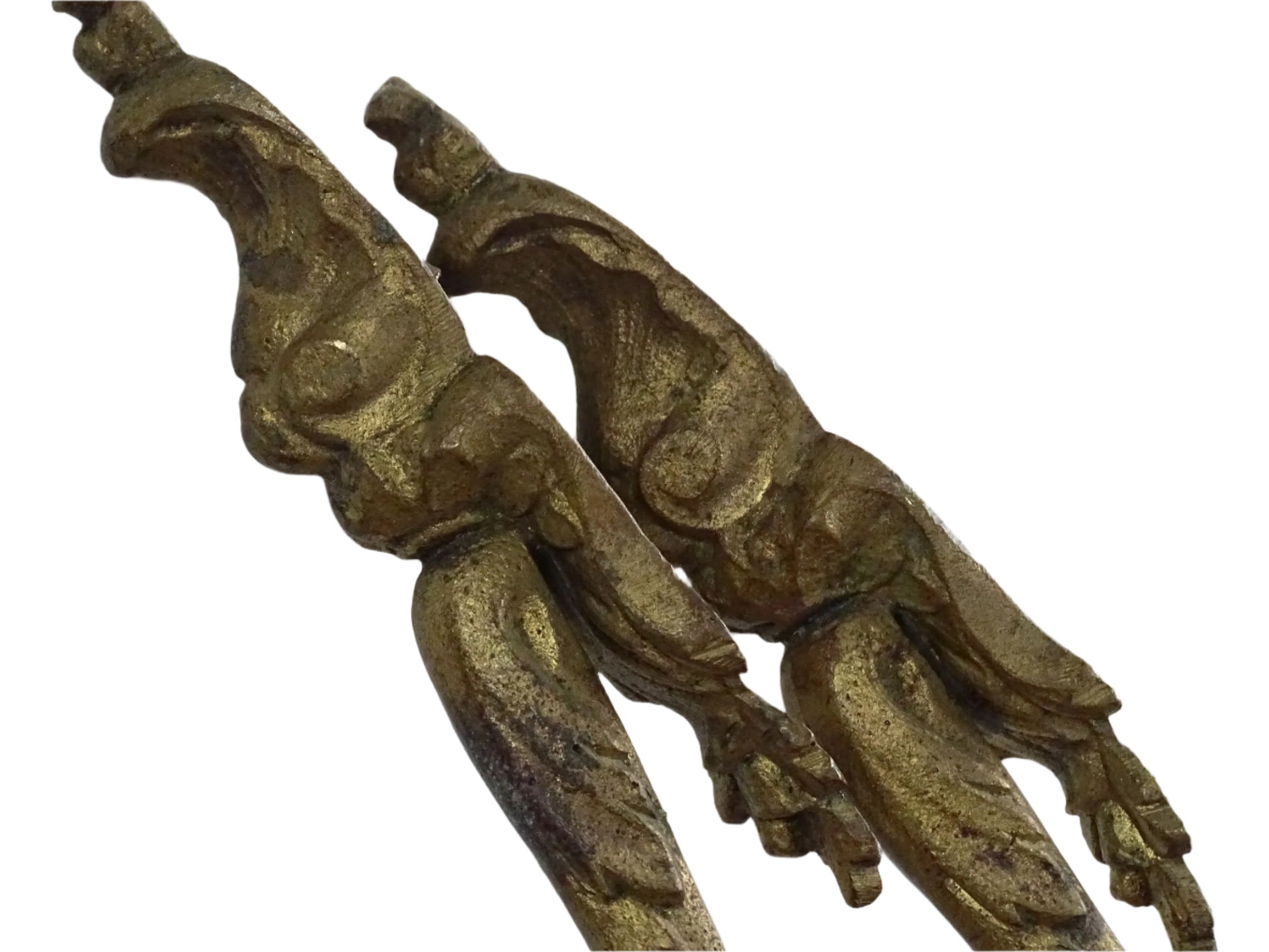 Pair of French antique curtain holdbacks in gilt bronze or brass. Highly ornate, a basket of flowers adorn the ends, giving them a wonderful whimsical appearance, and scrolls decorate the bars.