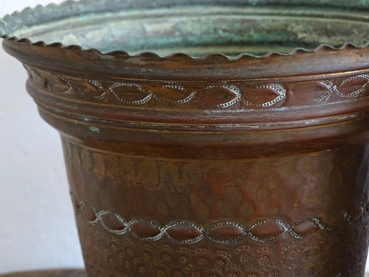 Pair of French vintage copper planters by Jean Goardère. These decorative copper plant pots have a crimped edge and an etched pattern with a hammered copper body.