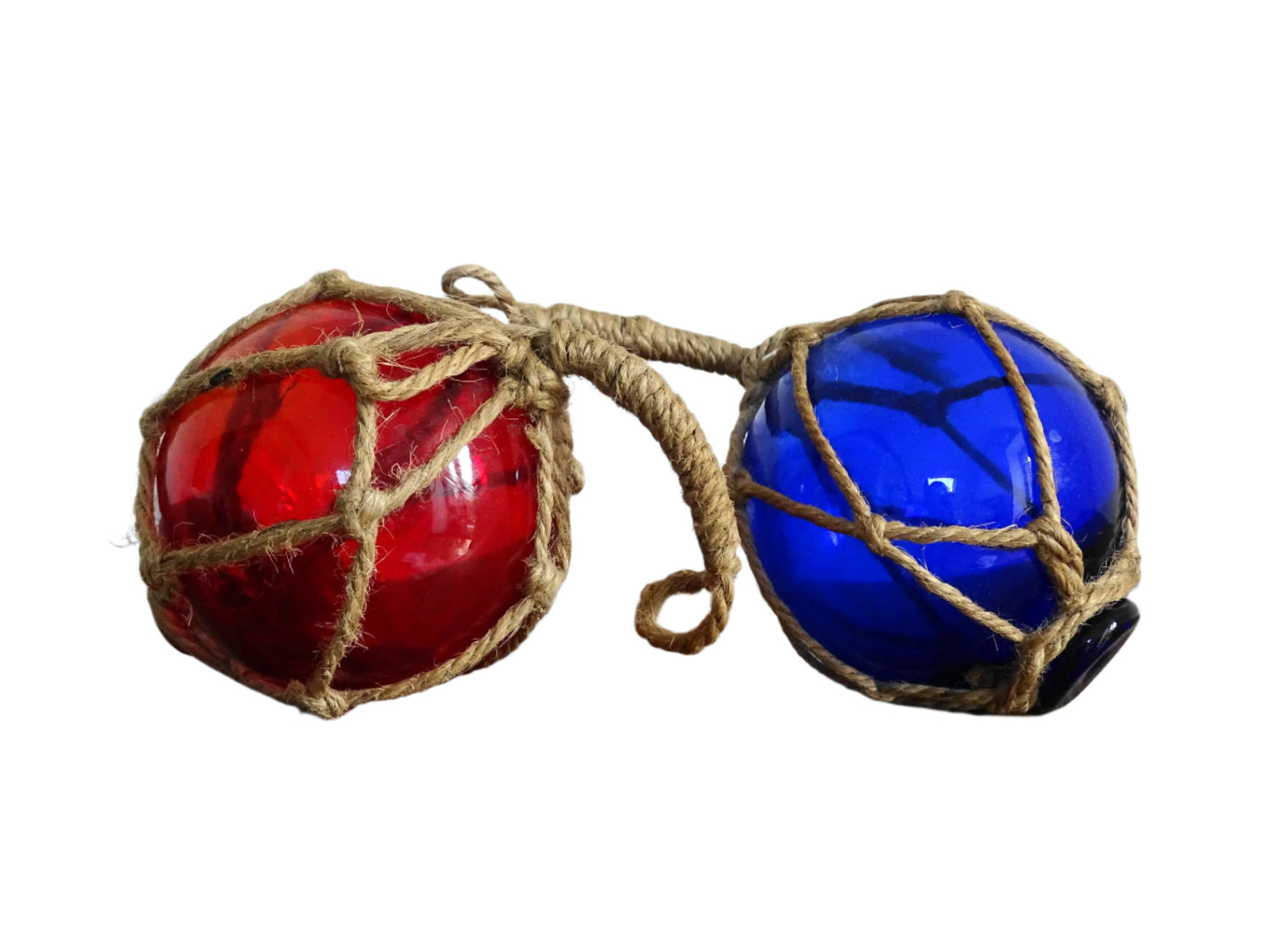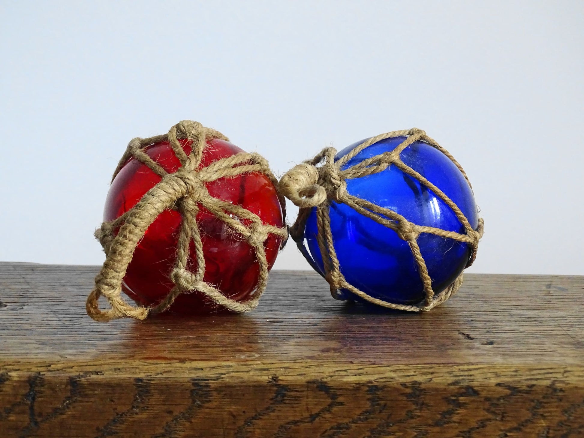 Pair of French vintage glass fishing floats in red and blue glass, netted in a natural colour rope. These glass buoys were used to mark fishing nets or lobster traps and could now be used as decoration. Display the decorative glass floats on a bathroom shelf or perhaps hang them by the window to catch the light.