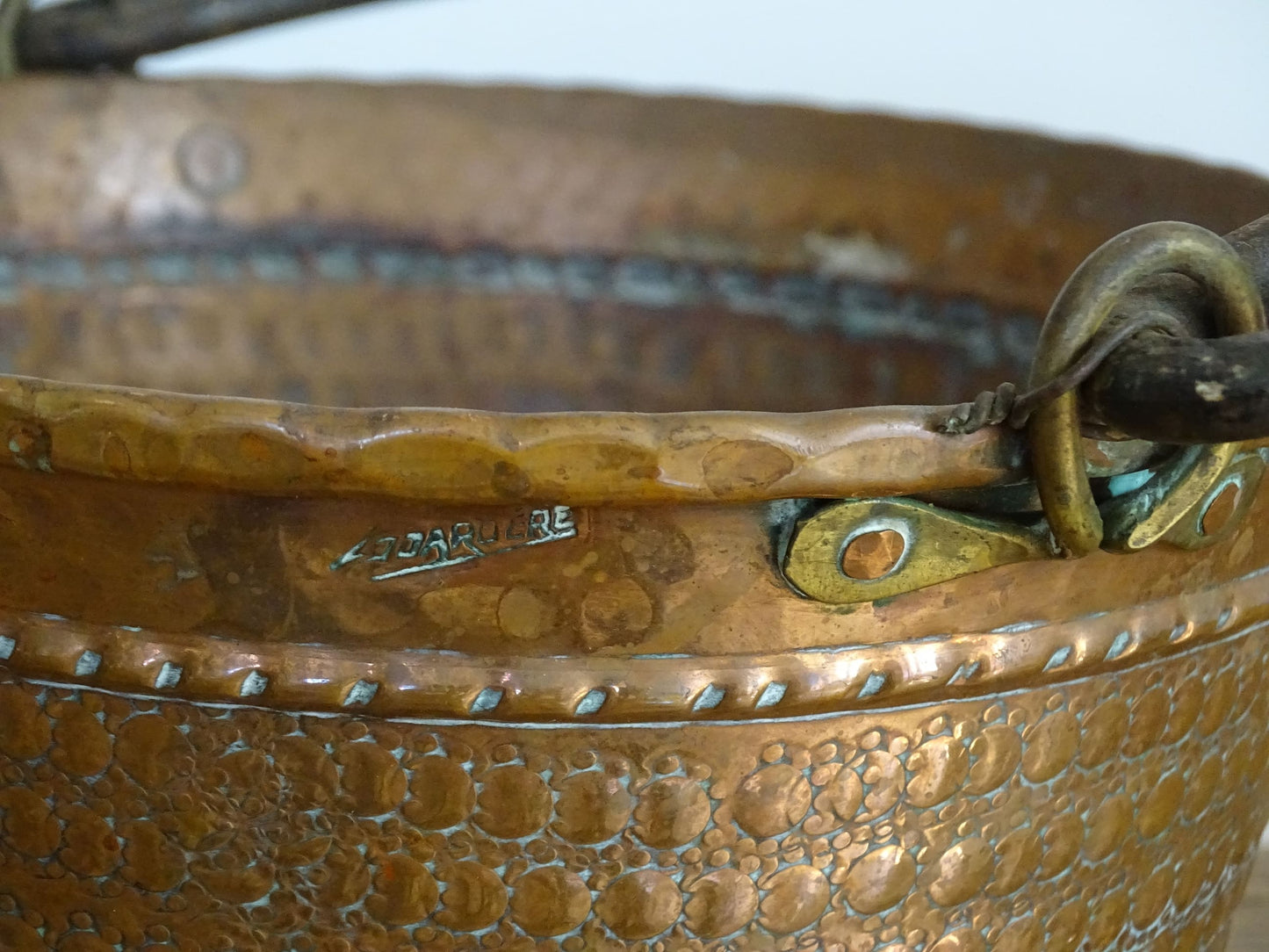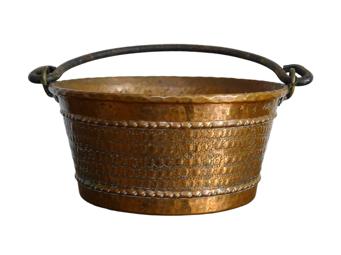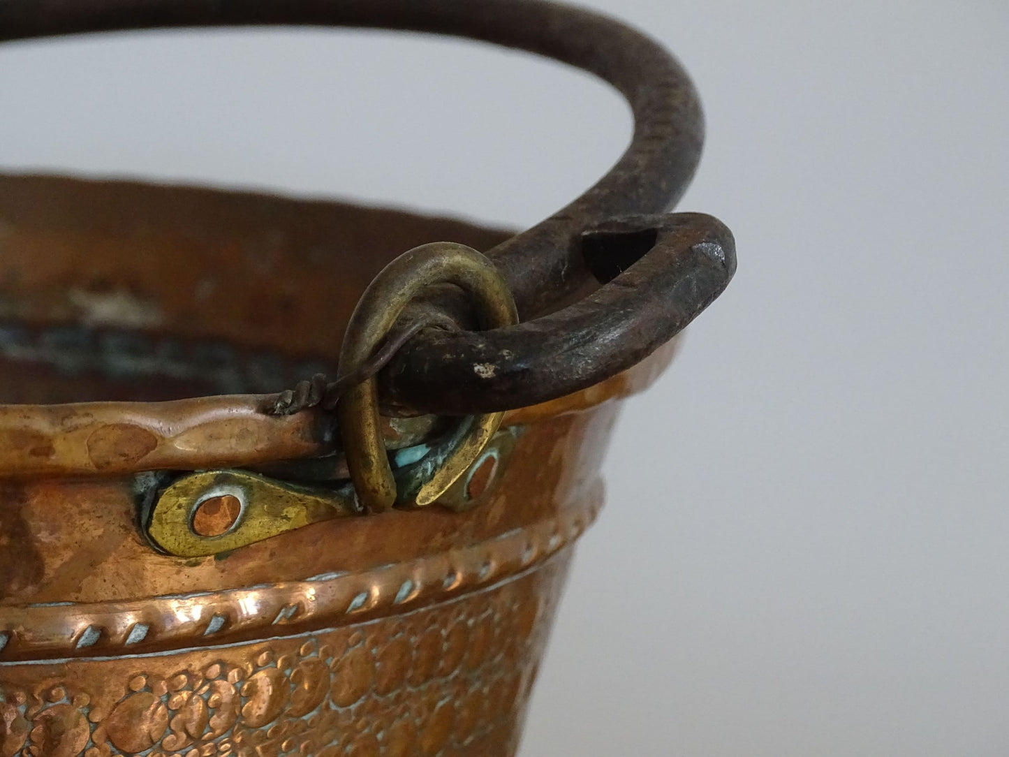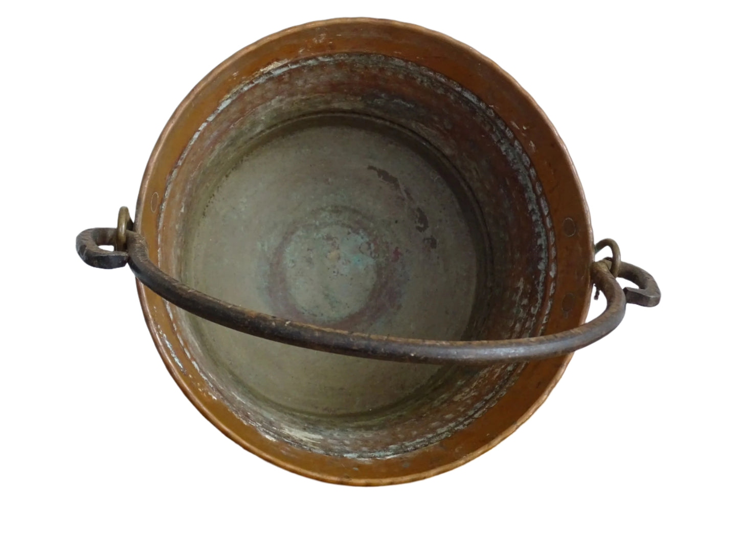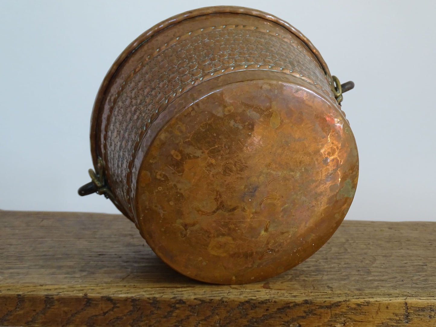 Small vintage copper cauldron with a hammered effect. It has a wrought iron handle and delicate brass detailing. This small copper cauldron could be used as a planter to hold a leafy green plant.