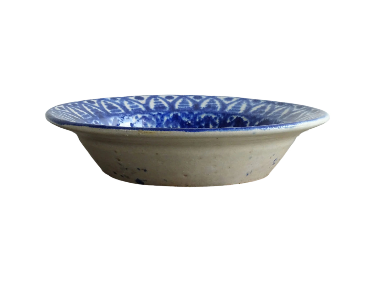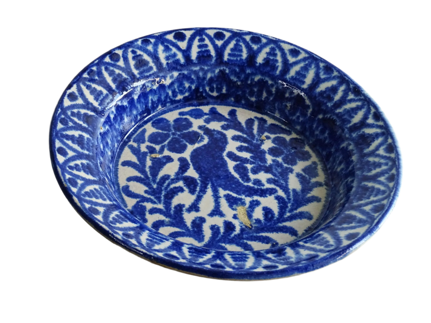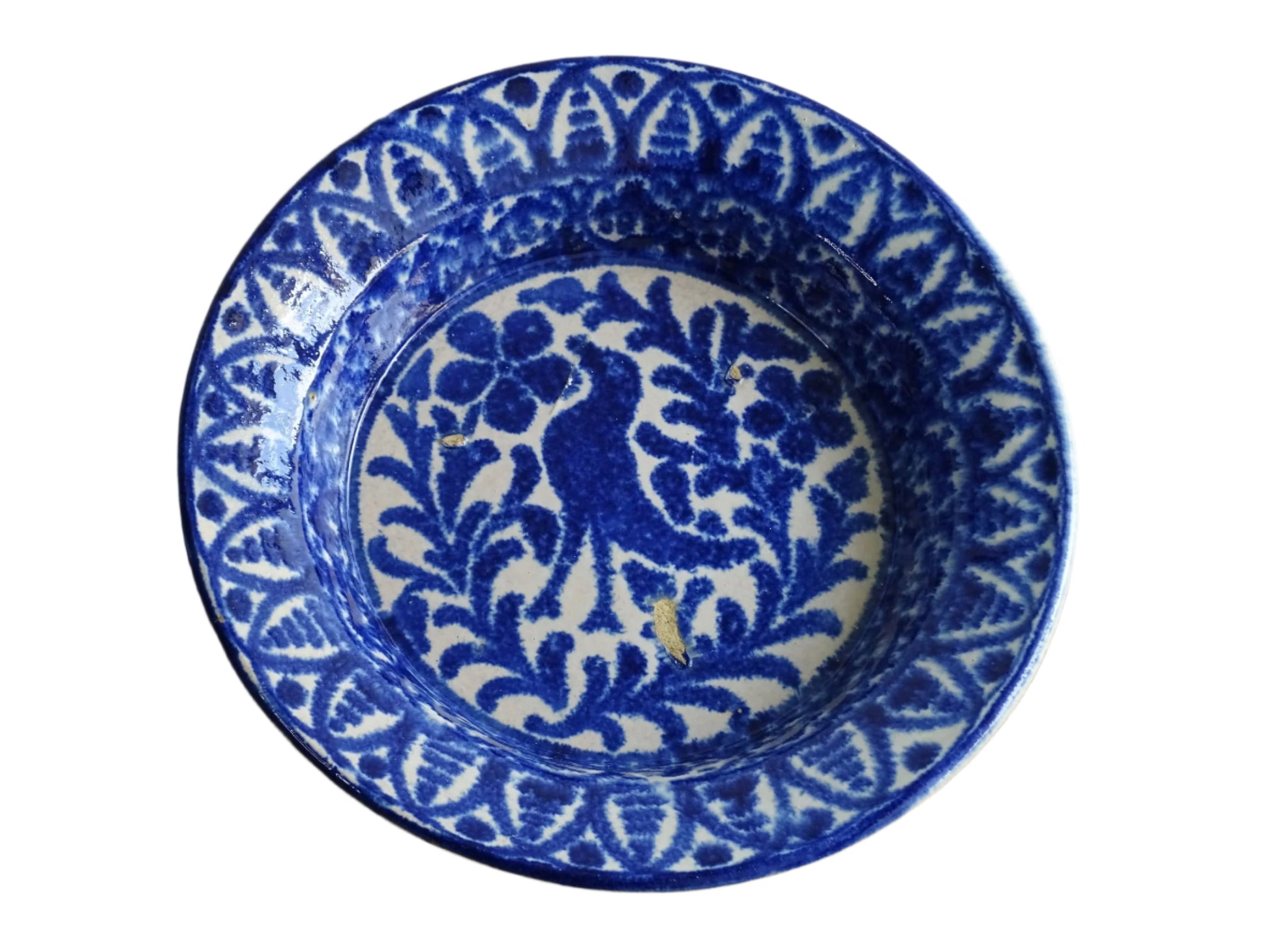 Spanish Antique Fajalauza Pottery Bowl with Blue Hand-Painted Bird 9.45"