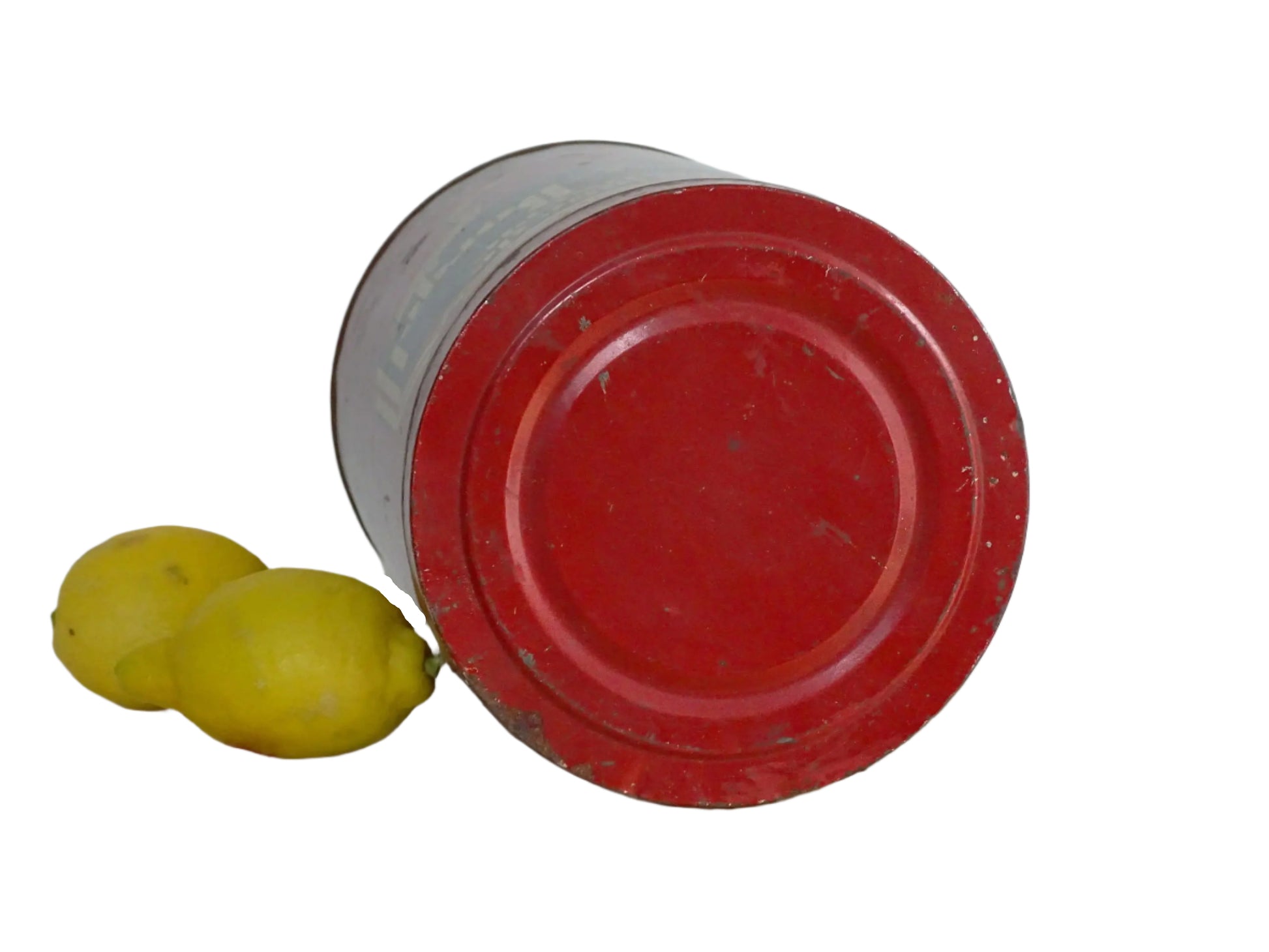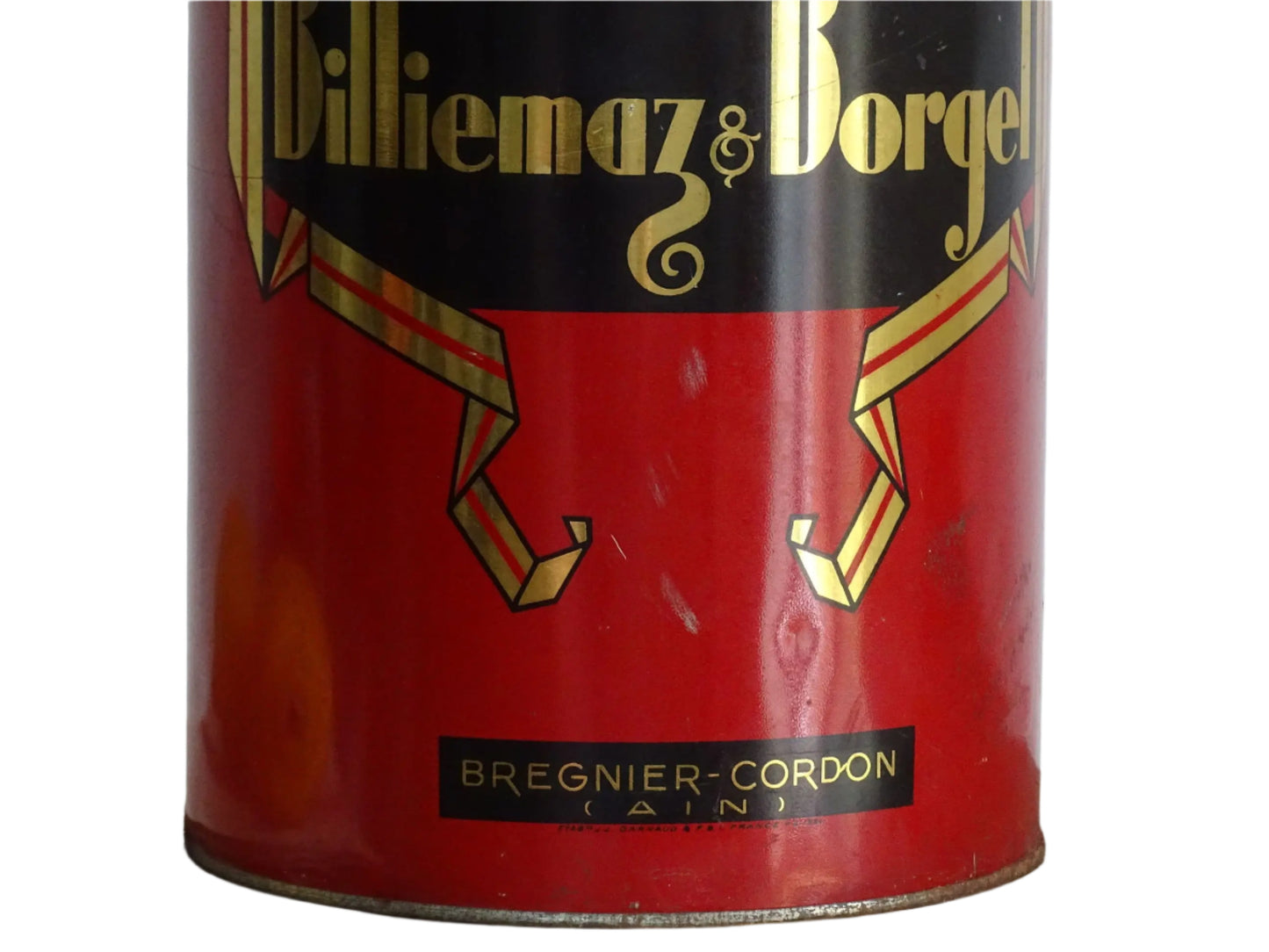 Vintage French riz or rice tin from the company Billiemaz & Borgel, who were based in the French department of Ain. Beautifully detailed in red and gold, it would look stunning displayed on a kitchen shelf.