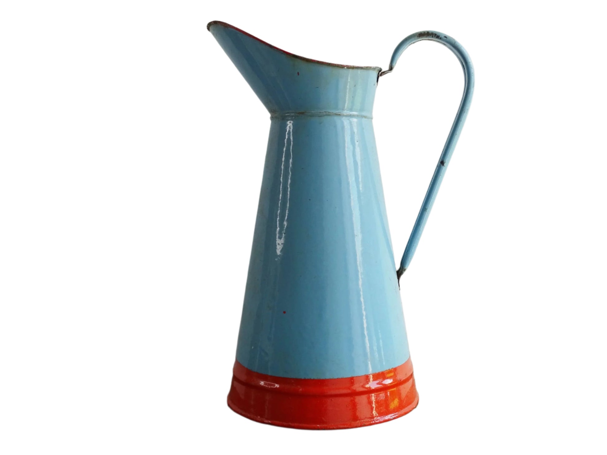 French vintage enamelware pitcher in blue and orange. So typically French, the sky blue colour is so eye catching, with the pop of orange to contrast. Fill the enamel jug with fresh flowers or dried lavender and display on a kitchen counter or entryway table.
