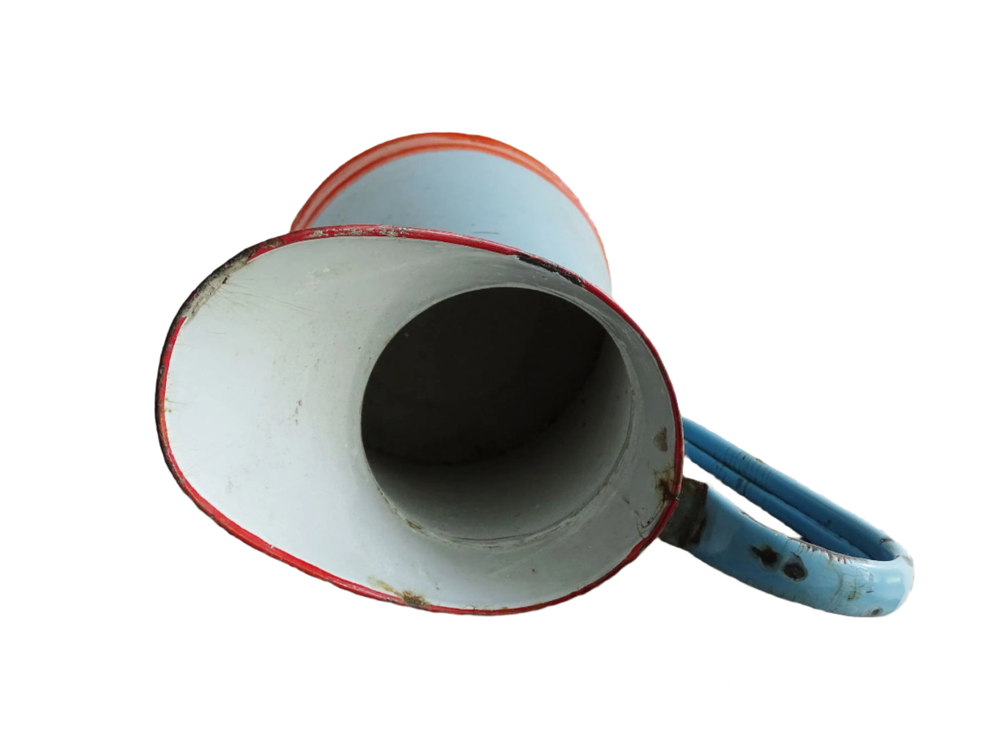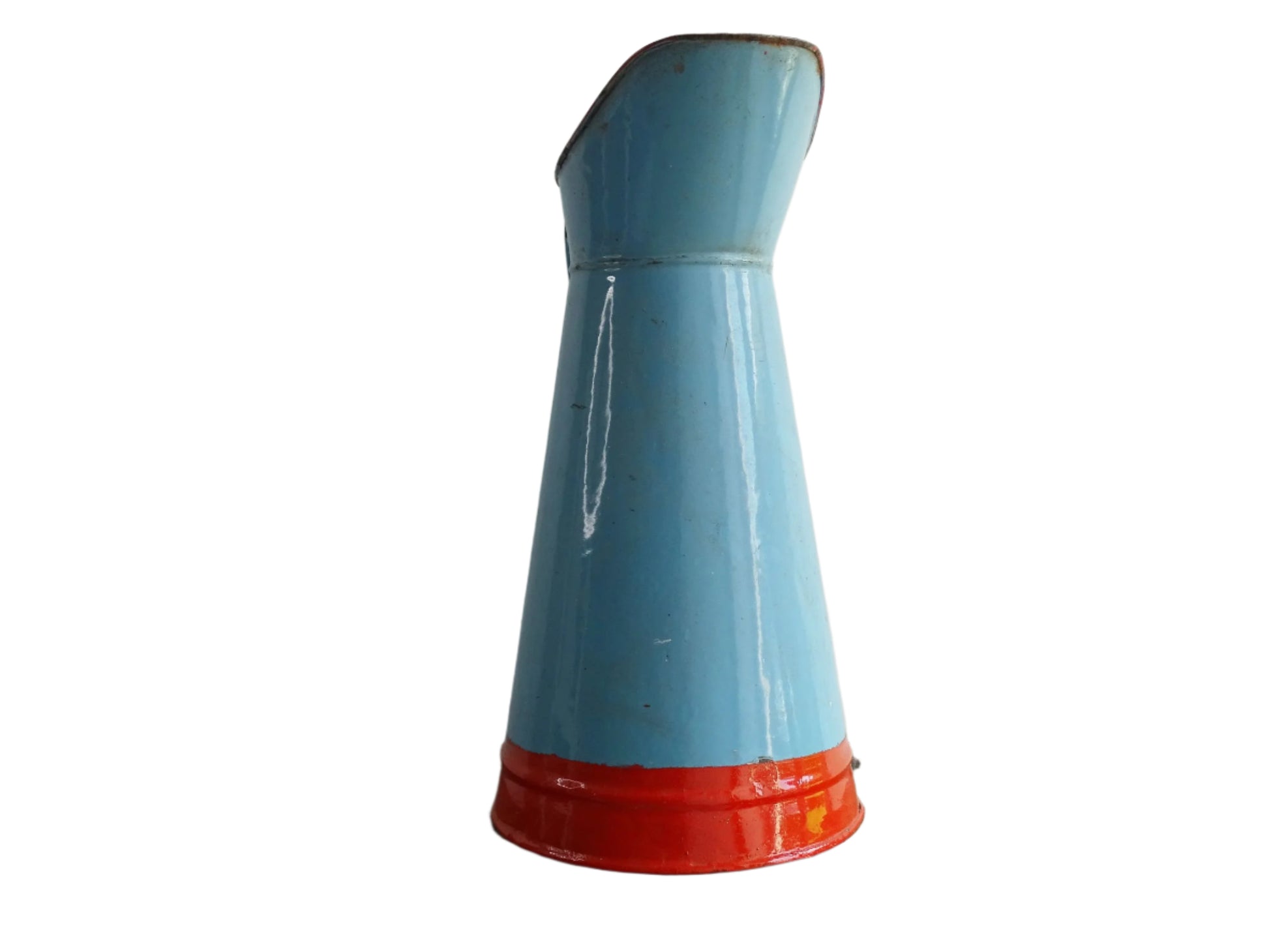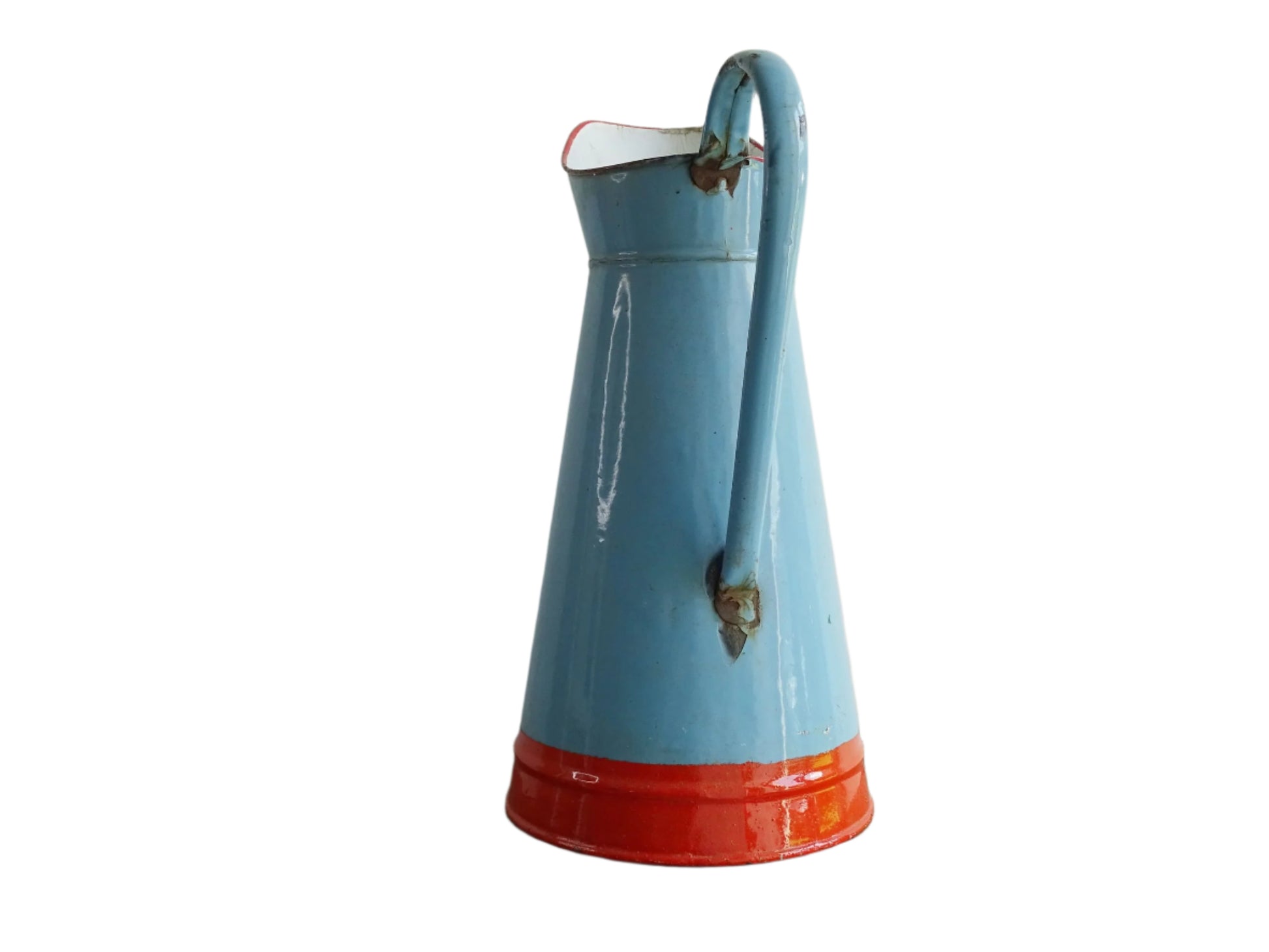 French Vintage Enamelware Pitcher in Blue and Orange Details: