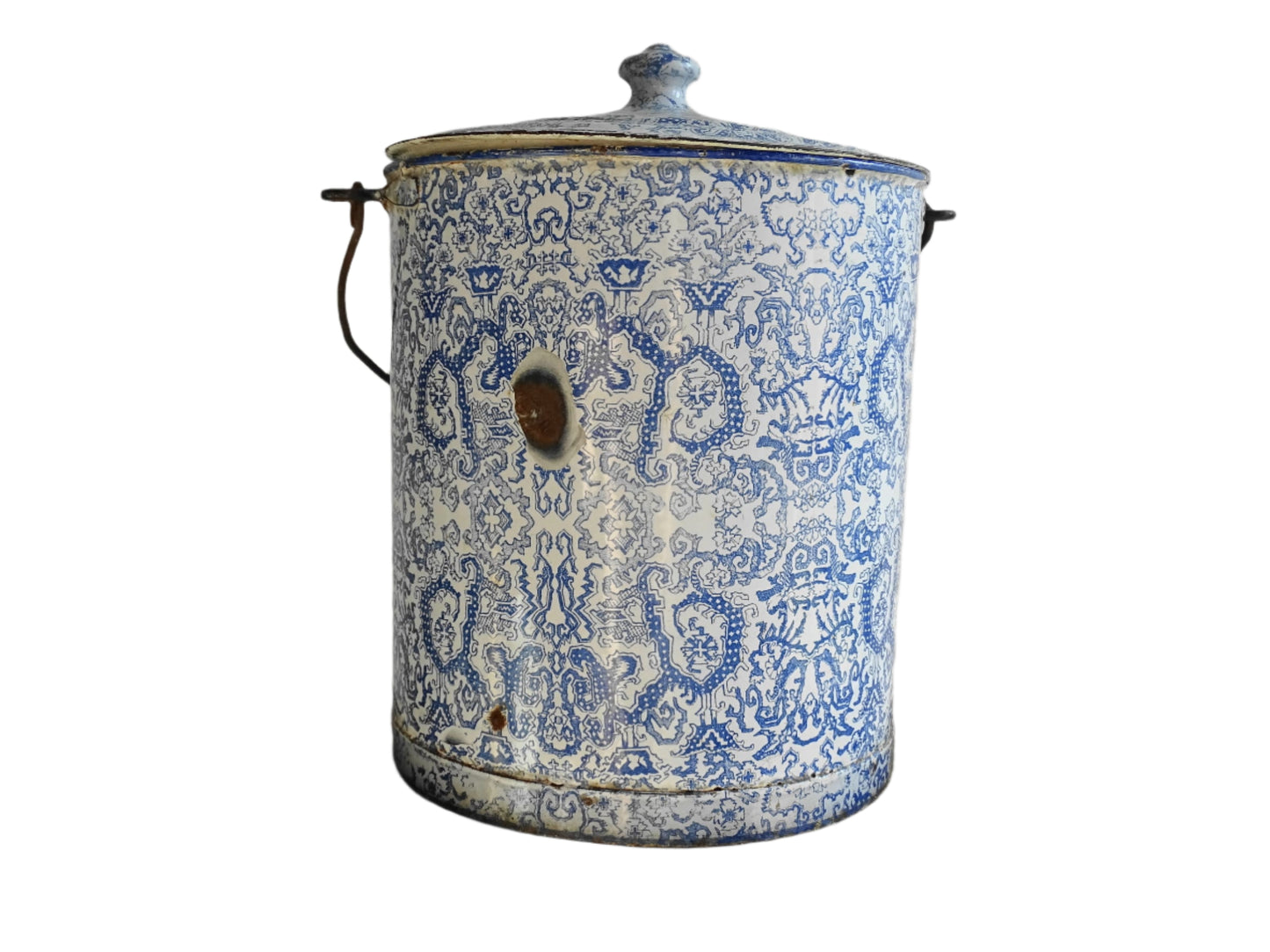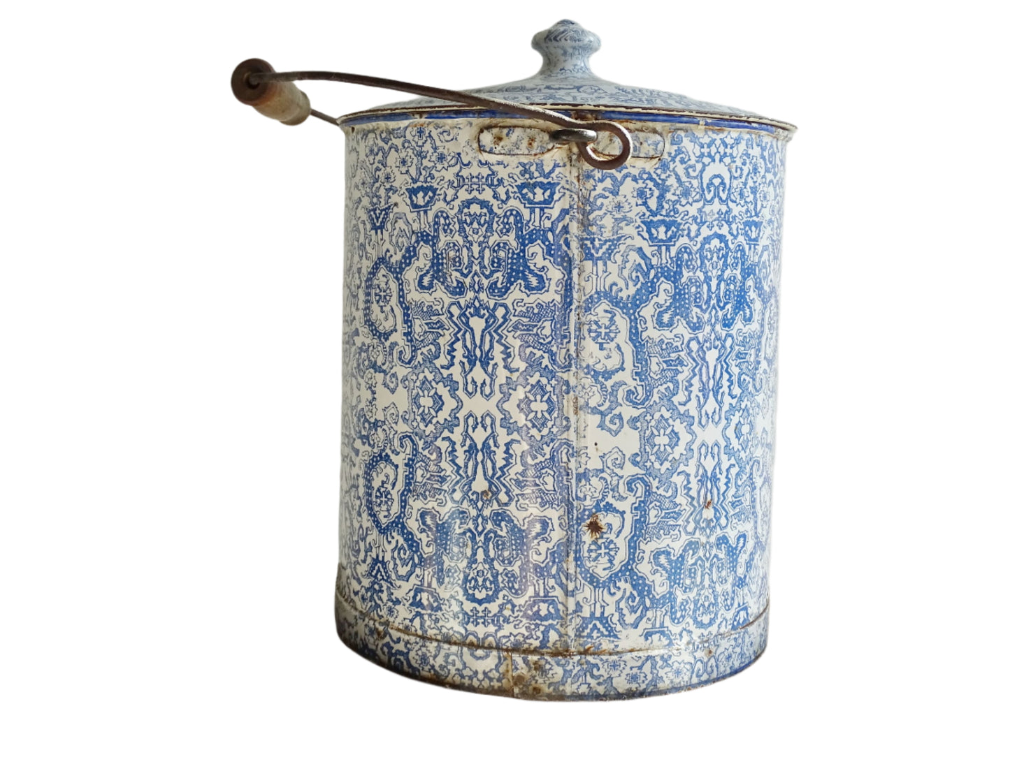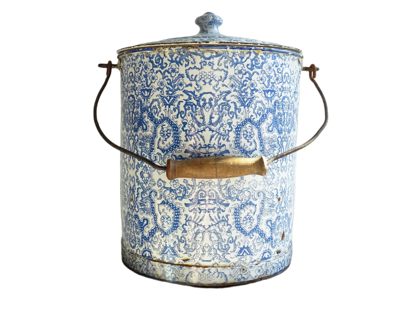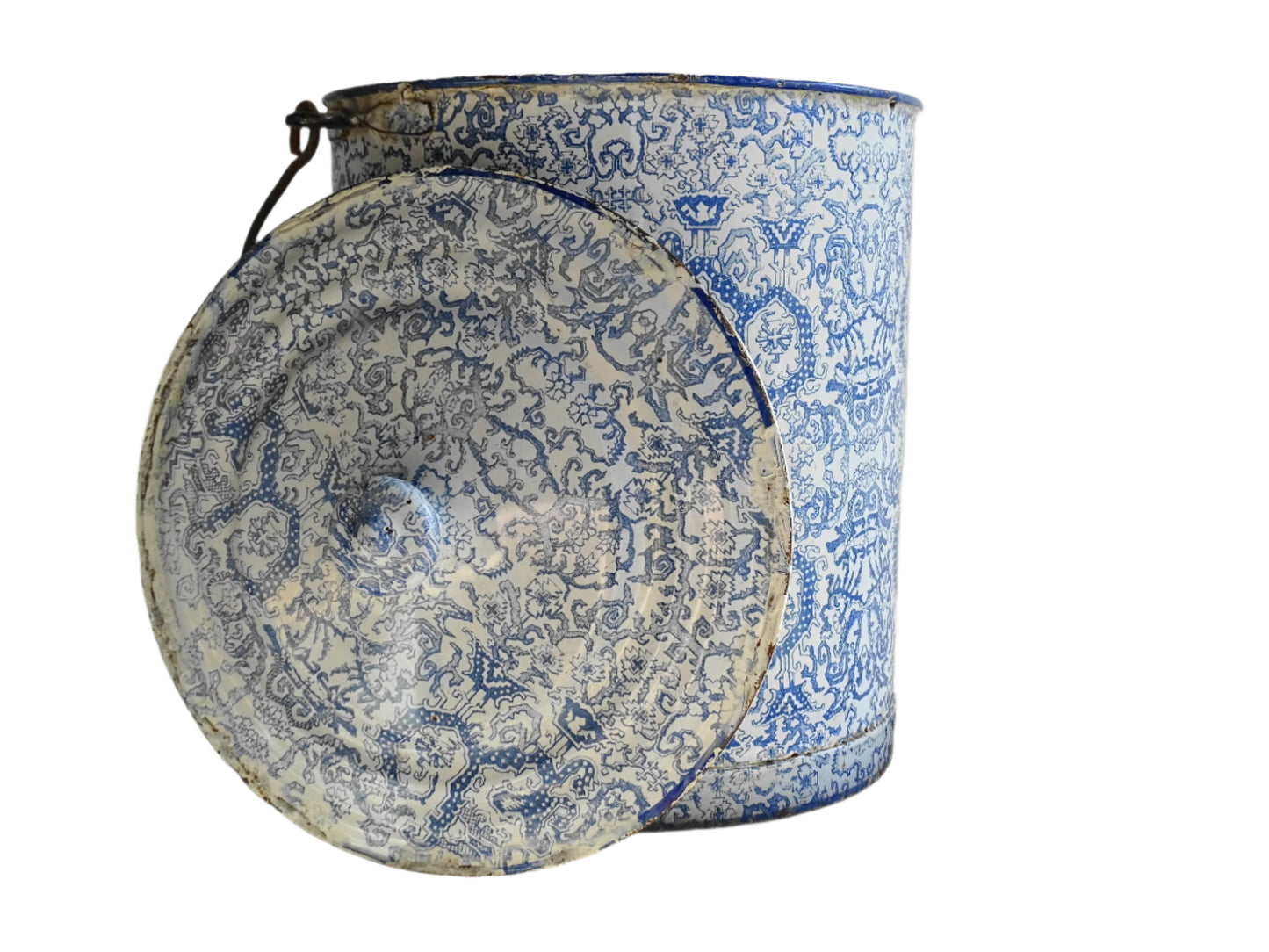 Vintage French Blue and White Enamel Bucket with Lid Details:
