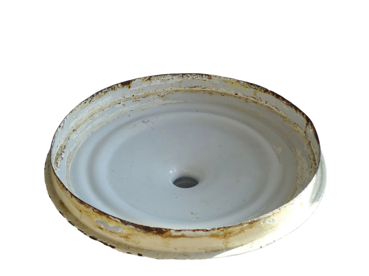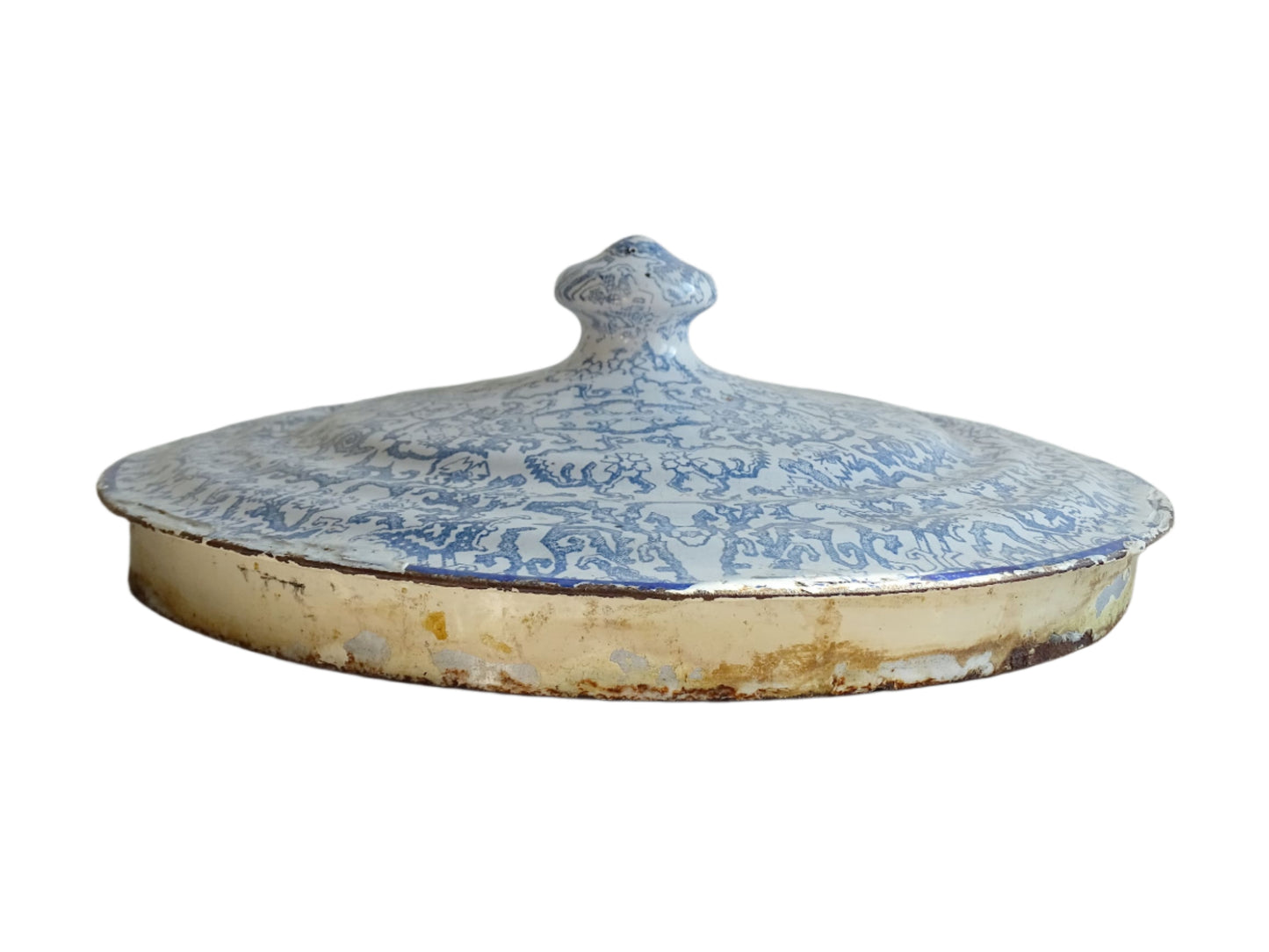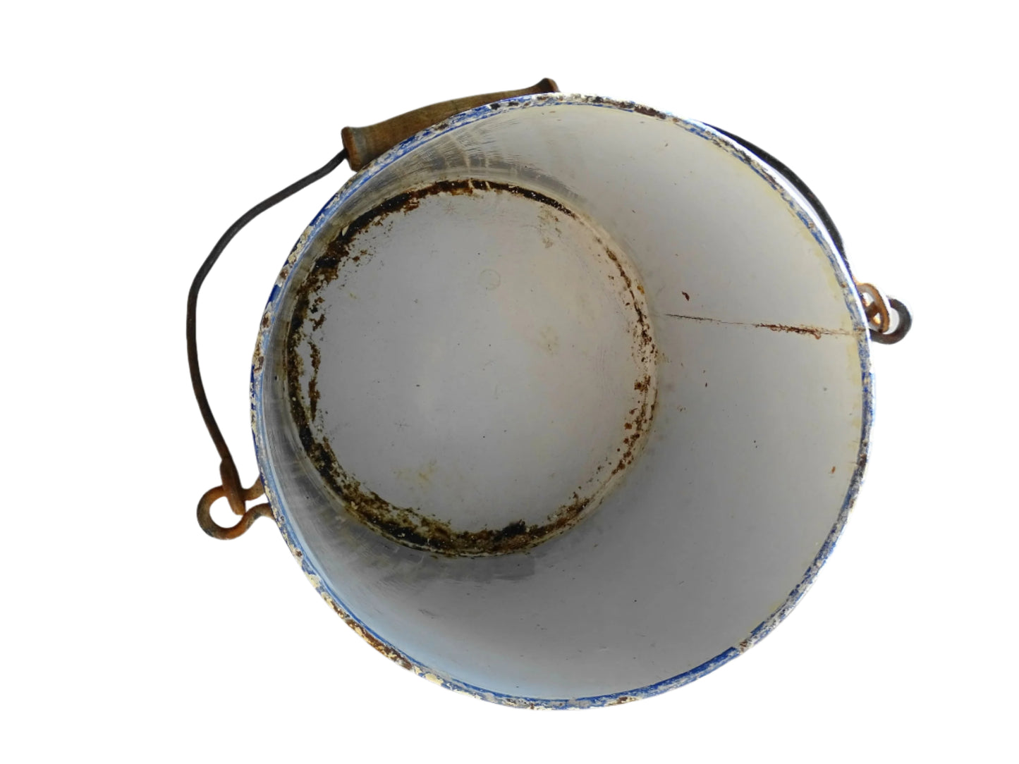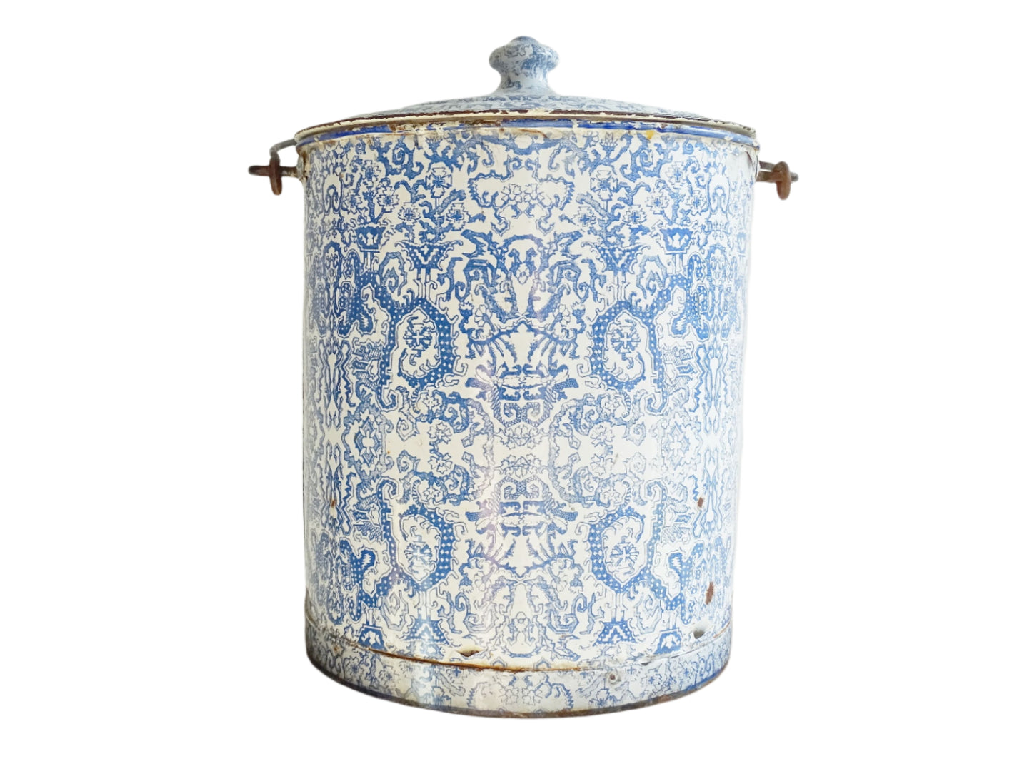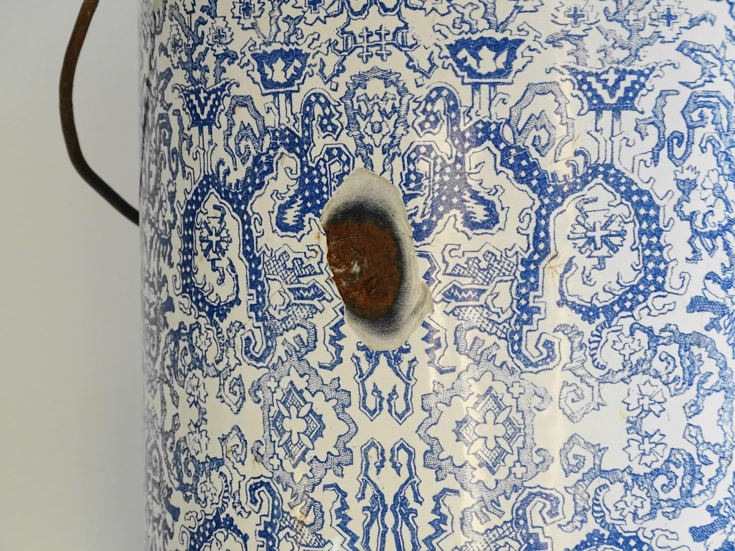 Vintage French Blue and White Enamel Bucket with Lid Details: