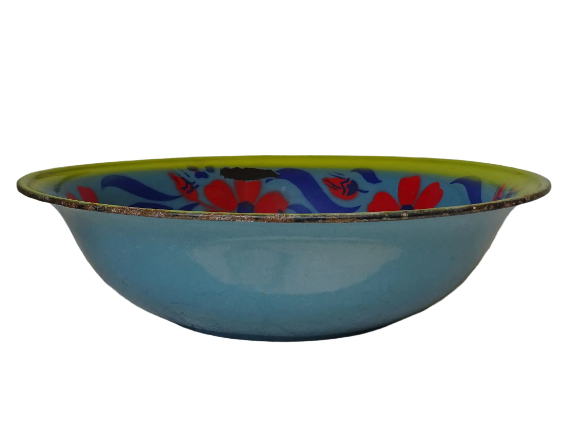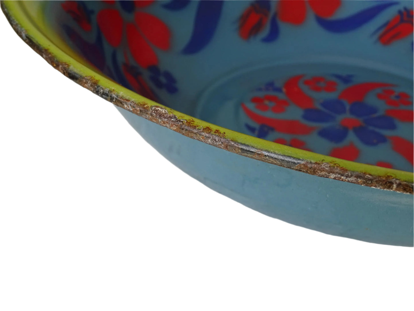 Large French vintage enamelled bowl with hand-painted flowers. The bowl has a blue background and decorated with large red flowers and leaves in a darker shade of blue for contrast, a bright yellow trims the edge. So typically French, this enamelware bowl would make a beautiful addition to a kitchen table.