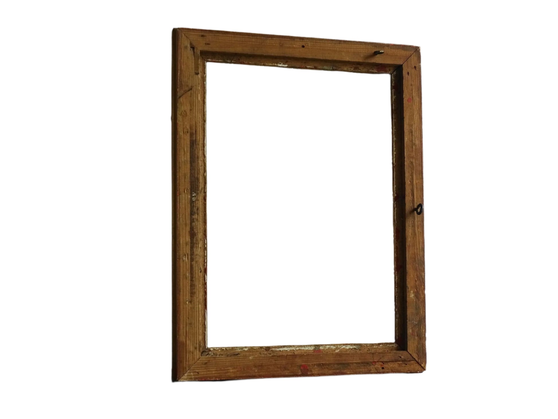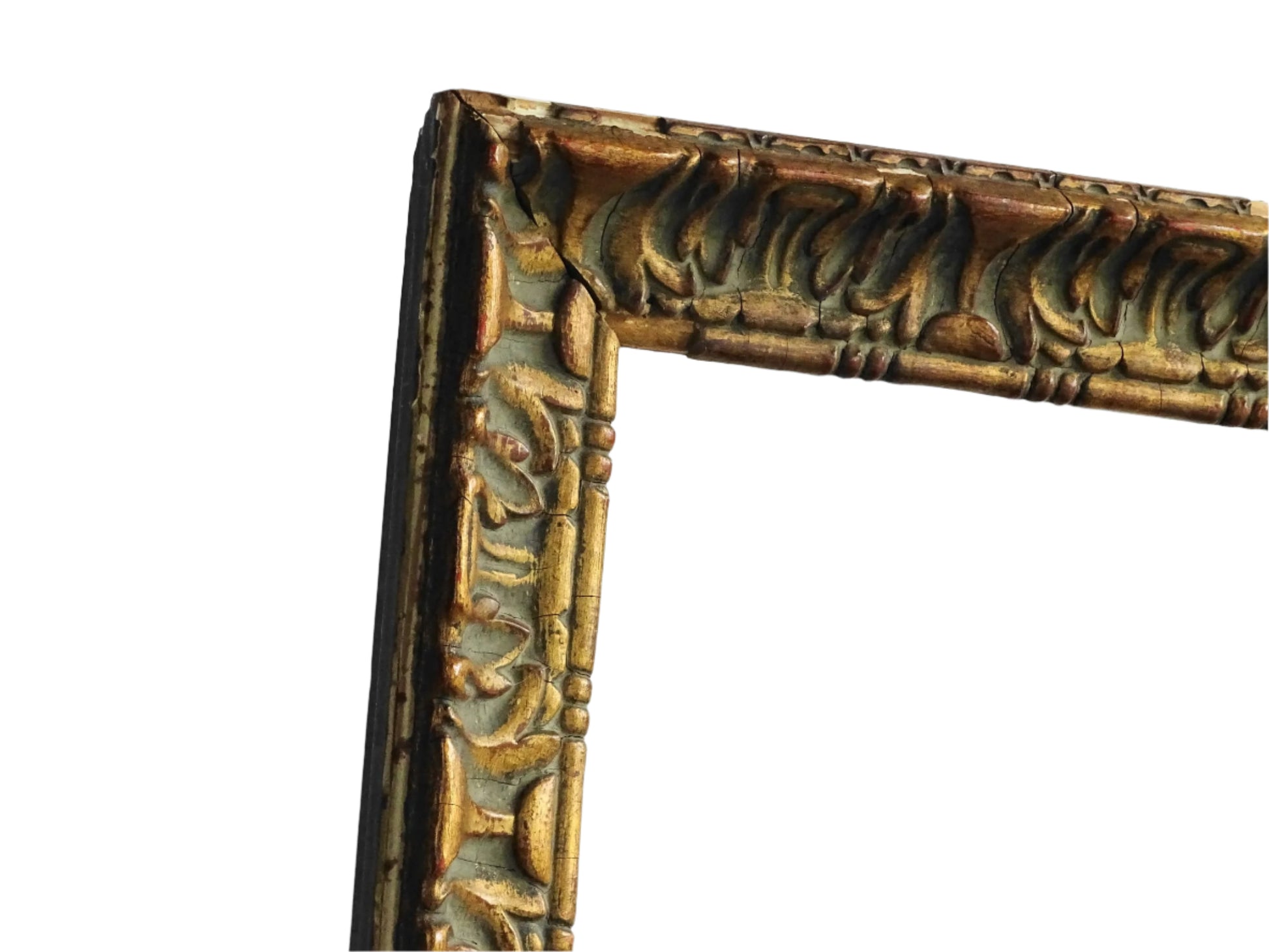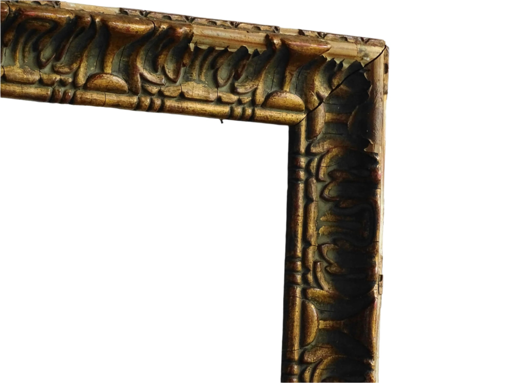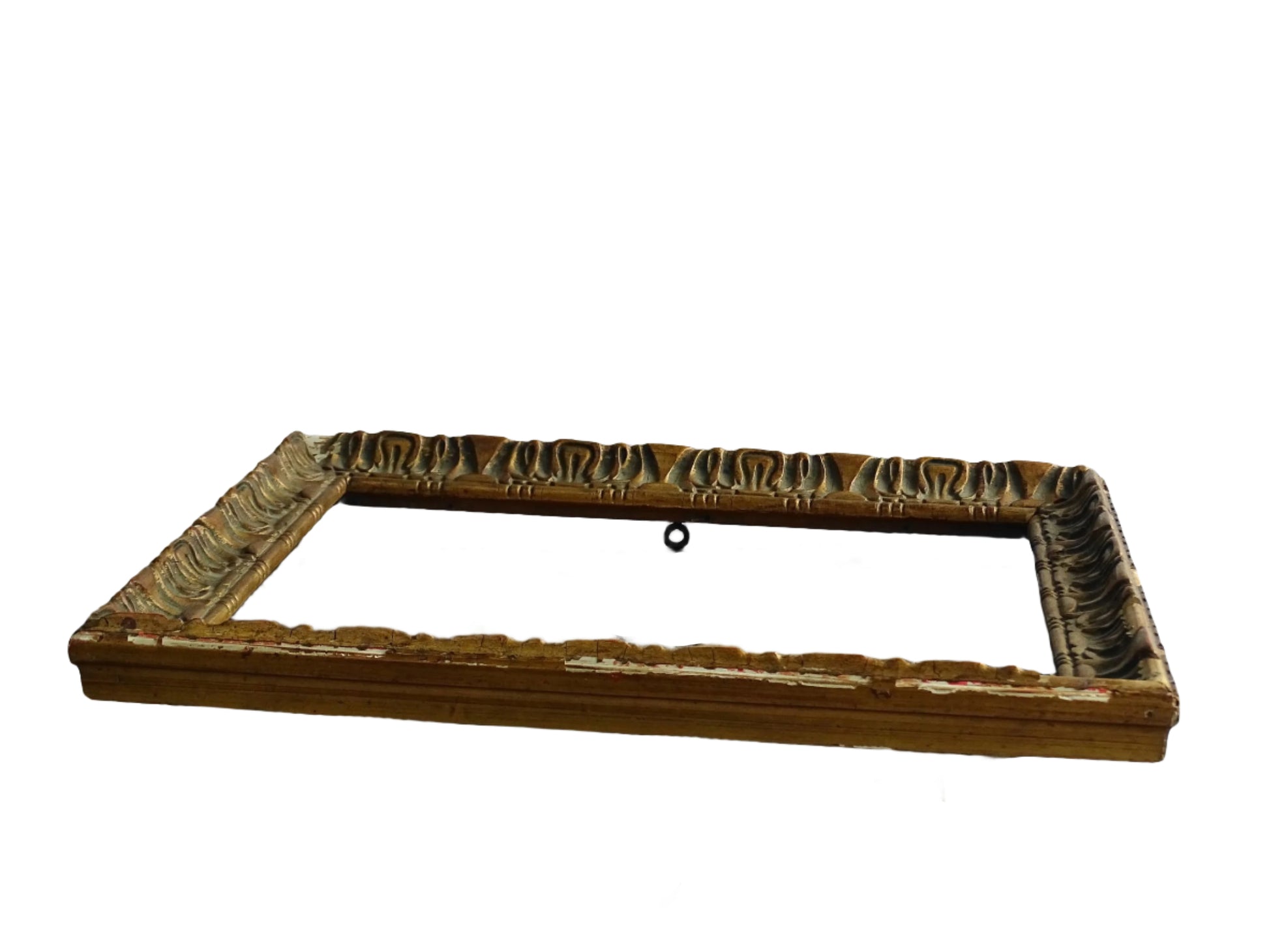 French antique gold picture frame with timeworn detailing. Crafted from wood and finished with a rich, gilded patina that has aged beautifully over time. The intricate, carved details and timeworn texture are perfect for enhancing a classic or eclectic decor style.