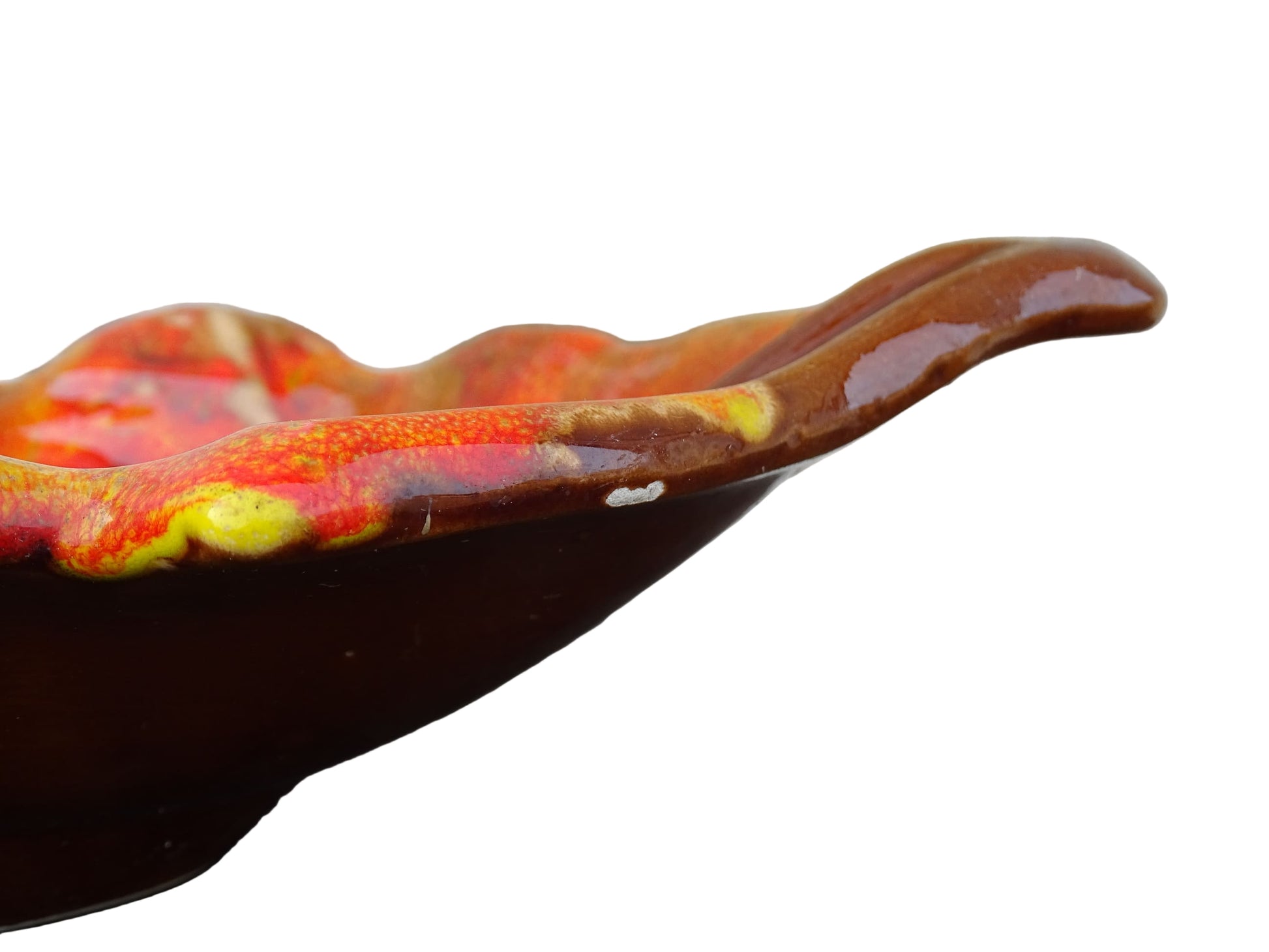 Large French vintage Vallauris pottery bowl in the shape of a leaf. It is glazed with beautiful autumnal colours of red, brown and orange. This gorgeous ceramic dish would make a perfect mid century centrepiece.